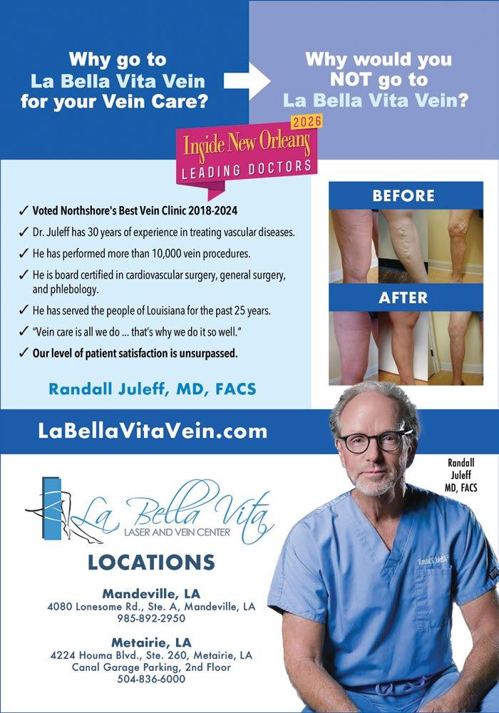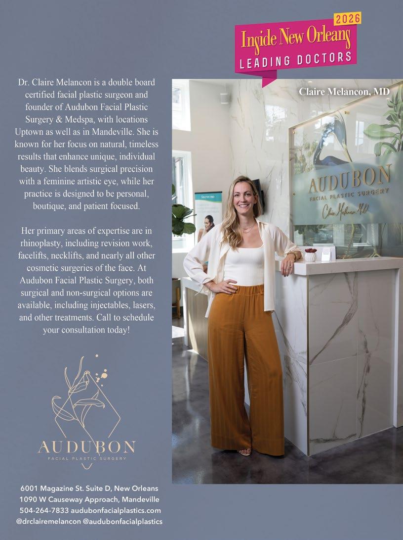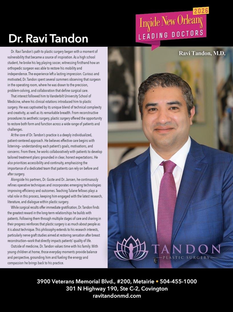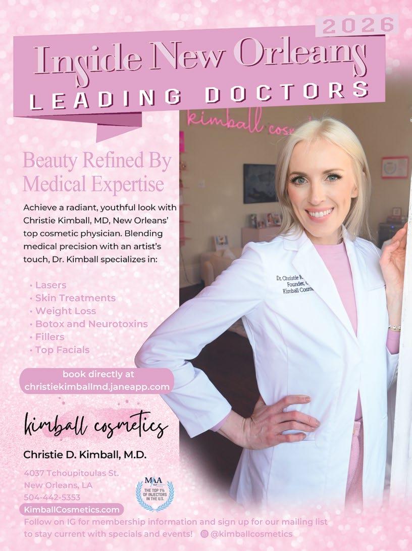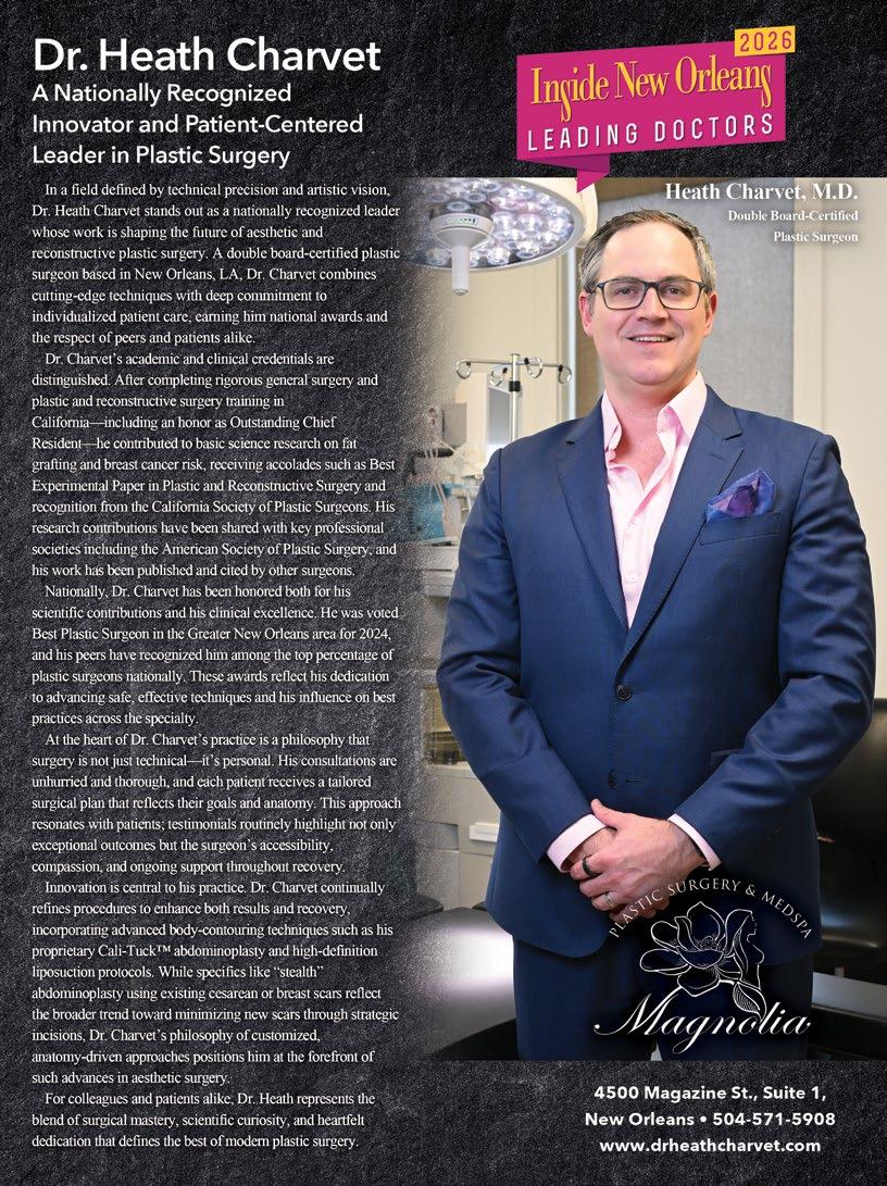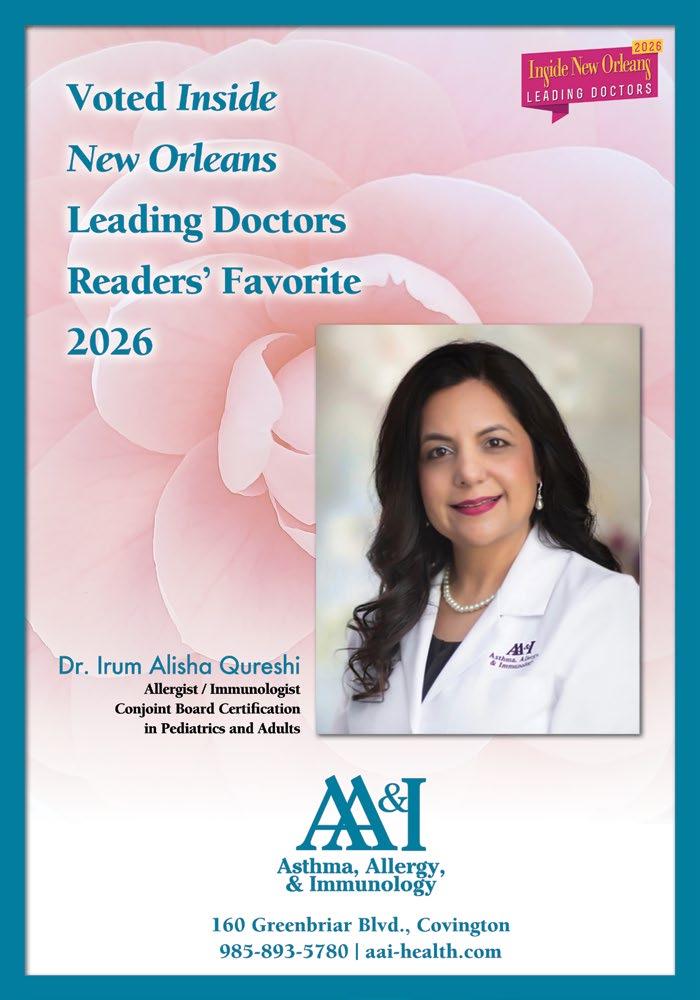 Finding good healthcare has always been a priority of mine. In this issue, you voted and we listened. Inside New Orleans’ 2026 Leading Doctors Readers’ Favorite list and editorial feature gives an insight into cutting edge medicine across our Greater New Orleans area, found starting on page 16.