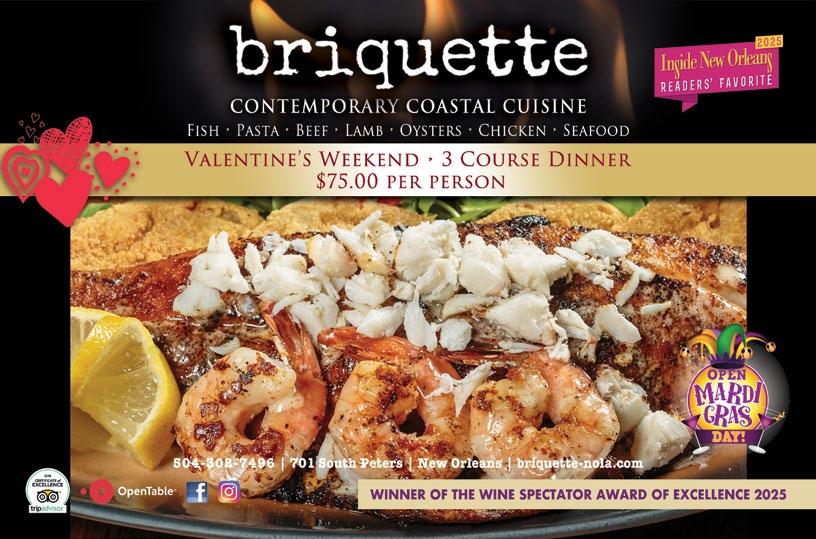 Award-winning contemporary coastal cuisine featuring Gulf seafood and fish, beef, lamb, chicken, Maine lobster and unique chef specials daily. Briquette Restaurant, www.briquettenola.com Call 504-302-7496 to make reservations or open table.