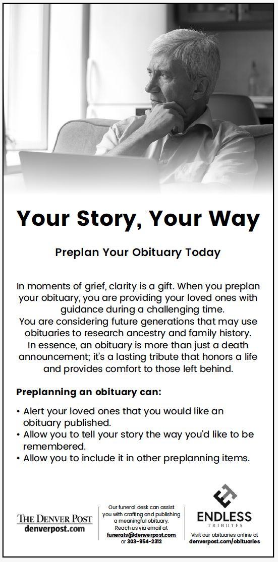 The Denver Post publishes ads in the printed edition and on our Endless Tributes website encouraging people to consider their obituary and including it in their preplanning.