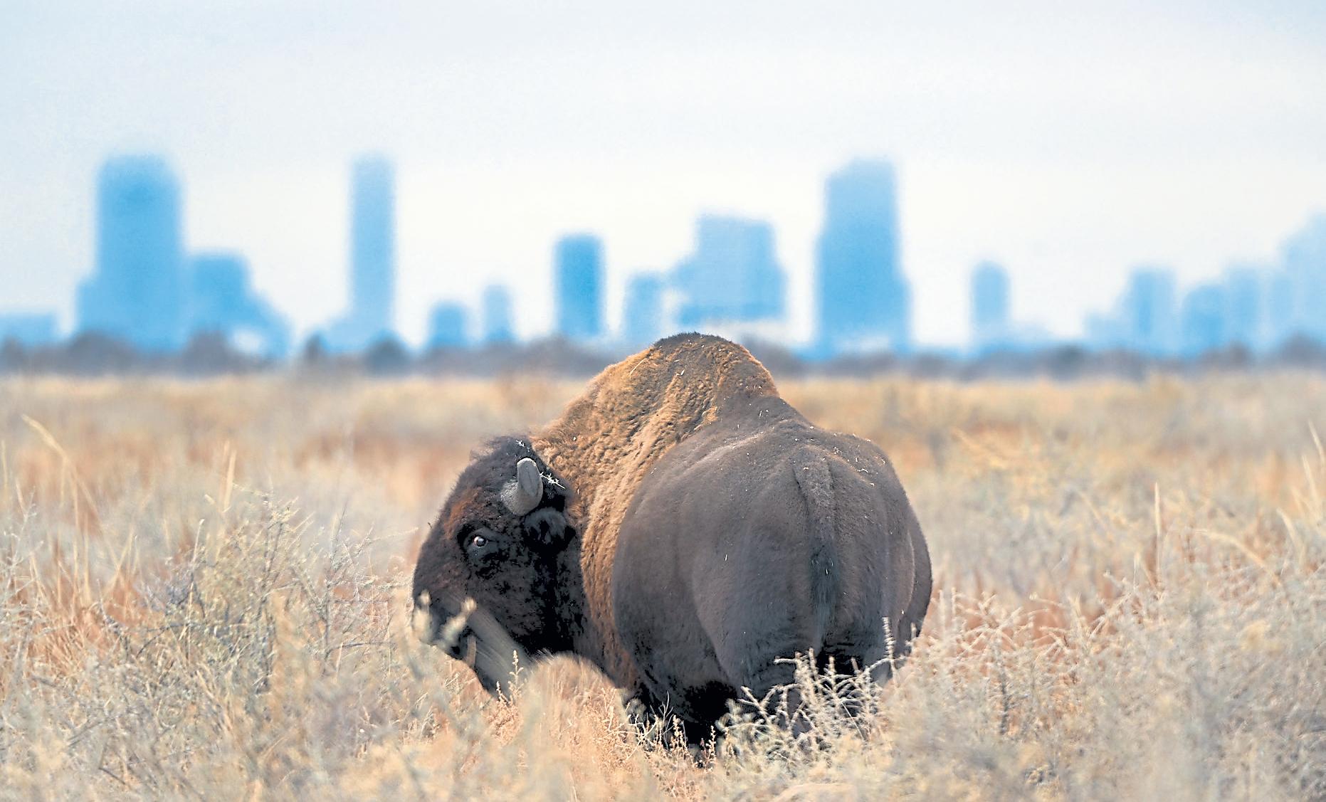 A bison gr azes in a field with the downtown Denver sk yline in the background at the Rock y Mountain Arsenal National Wildlife Re fuge in Denver on Dec. 12, 2023
