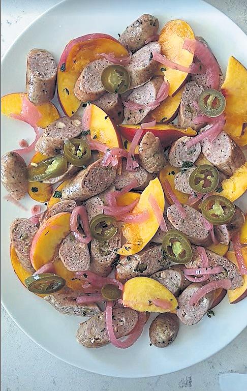 Grilled saus ages with peache s and pickled onions, a recipe from Polidori Saus age, a 100-year-old family busine ss in Denver