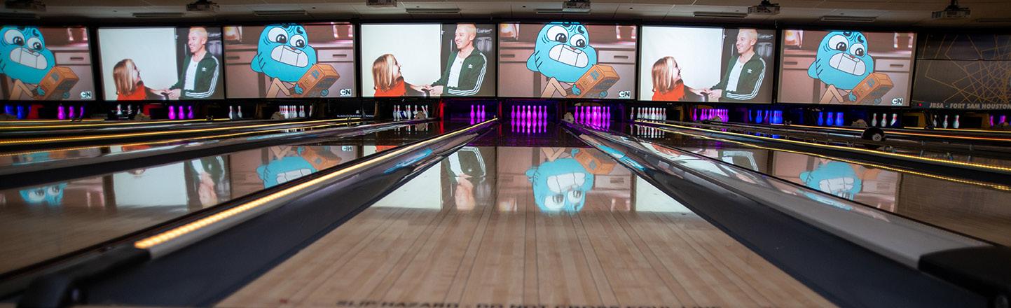 Galactic Bowling features cosmic lights with LED center punch deck lighting, lane capping, and ceiling lights. In addition, the experience includes three 118’ projection screens playing family-friendly music videos. Select your preferred exciting option to bowl as shown below.
