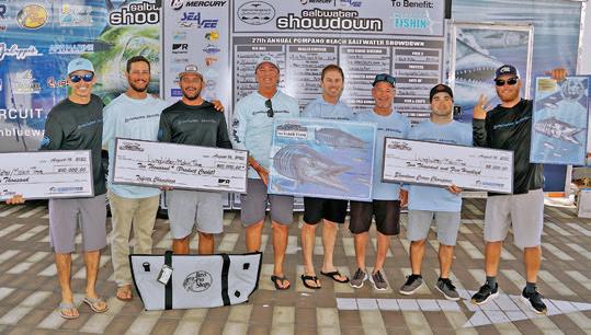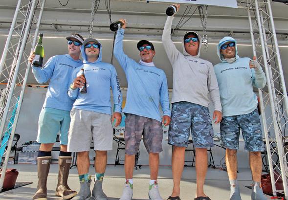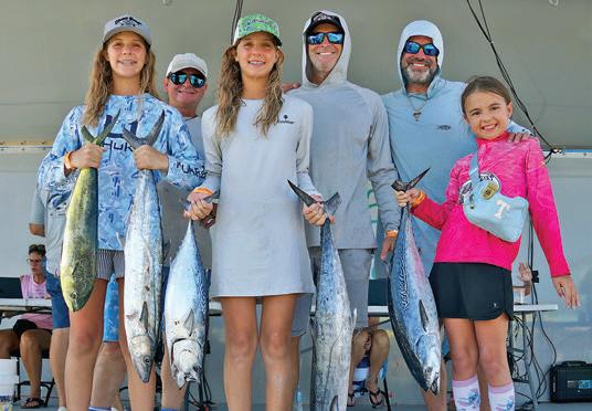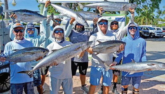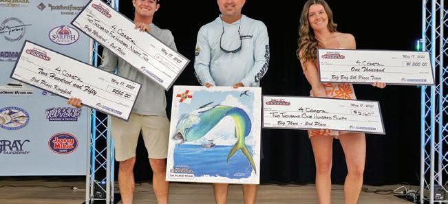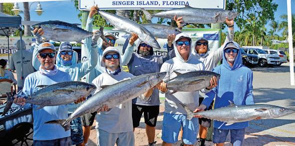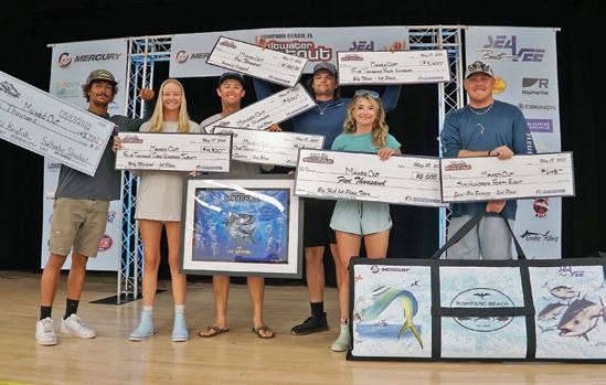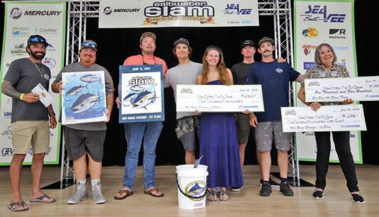 The Slam in June proved to be challenging on our prefishing day, but Alex had a solid report from a few buddies that fished north of Jupiter on Friday. With Mike Fishman out for the Slam, we called Tony Melo to step in for this one. Tony had fished the Quest for the Crest series and the Ft. Pierce Kingfish tournament with us last year, so he had great chemistry with our team! On tournament morning we made our way north of the fleet to the spot Alex’s buddies did well. With only 2 other boats in the area, we were able to pick off a few nice fish early and had 100 lbs. with our 4 biggest kings… Chris Fishman and Chris Zislin had the hot hand that morning. A er we caught our kingfish, Capt. Ryan Goldman spoke to a buddy that was fishing south and had a solid tuna bite off Palm Beach, so we headed south to find a few. We had 2 tunas in the box pre y quick, however, the bite slowed and we knew we needed 2 more to have any chance at pulling off a win in the Slam. Our team always fishes hard till lines out, so Capt. Alex reset for a final dri and with 30 minutes le , we put 2 more tunas in the box at the buzzer! We knew we had around 170-180 lbs., but we weren’t sure if that would be enough for a win in June. A er all the boats weighed in, we were stoked to see that our 177 lbs. was enough to hold off Captain Carl Torresson and the Slob City crew and secure the win for us in the Slam.
