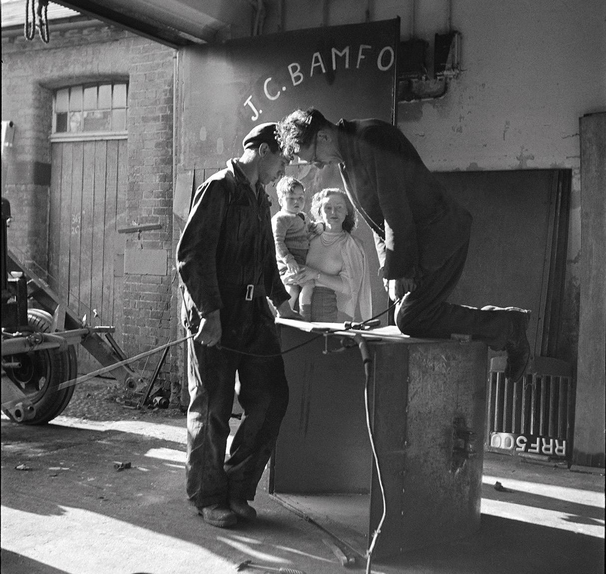 1948- JCB moves to stables at Crakemarsh Hall. Anthony Bamford in the arms of his mother Marjorie as JCB's first apprentice Bill Hirst (left) and Arthur Harrison are at work.