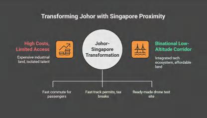 For decades Johor lived in Singapore’s economic shadow In the age of low-altitude commerce, geography flips to super-power: Malaysia supplies scale and cost-efficiency; Singapore delivers capital, certification and R&D If regulators harmonise quickly, the air between 0 and 3 000 metres could become Southeast Asia’s busiest and most lucrative economic zone before the decade is out.