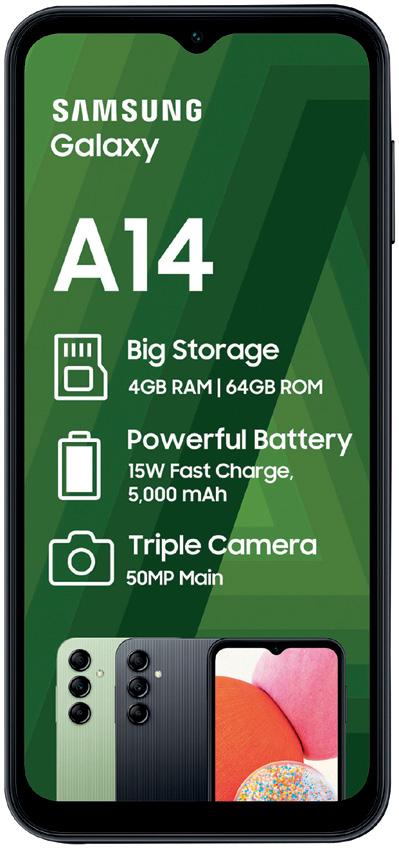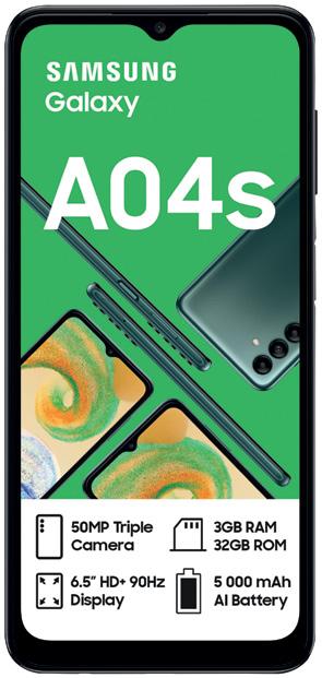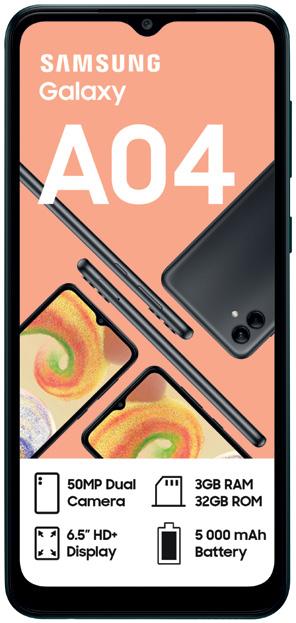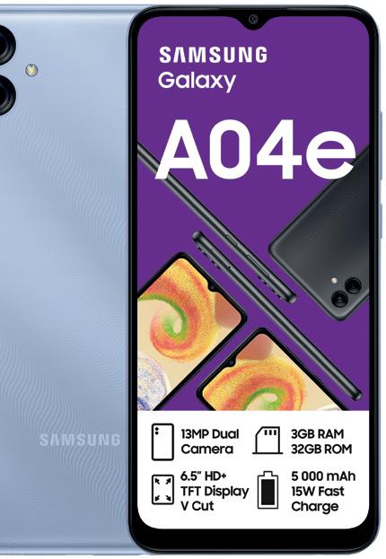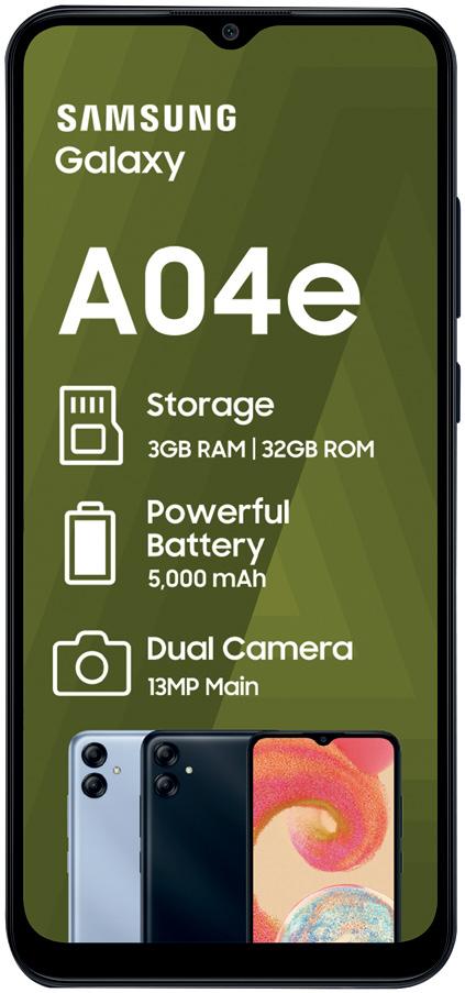 02 | All offers are valid while stocks last at selected stores. Contact your nearest store for availability or order in store and online. Ts & Cs apply. For full terms and conditions, please refer to page 20. Phones on contract Galaxy A04s Smartphone • 6.5-inch HD+ TFT (90Hz) Display • Camera: 50MP+2MP+2MP+5MP • 32GB Storage and 3GB RAM • SD Card Expandible to 1TB • Battery 5000mAh • Fingerprint Sensor • 2 Year Warranty • (10286039/10285939) Galaxy A04 Smartphone • 6.5-inch HD+ TFT, V Cut Display • Rear Dual Camera : 50+2MP • Camera: 50MP+2MP+5MP • 32GB Storage and 3GB RAM • 5,000mAh (15W Fast Charge) • Micro SD Slot up to 1 TB • Android 12 • 2 Year warranty • (10286460/10286450) CONTRACT ON 179 PMx24 on a Red Flexi 140 Contract Plus You Get 20GB Data once Off R204 Once-off Sim & Connection CONTRACT ON 159 PMx24 on a RED Flexi 140 Contract Plus You Get 20GB Data once Off R204 Once-off Sim & Connection CONTRACT ON 239 PMx24 on a RED 600MB | 50 MIN Contract Plus You Get 20GB Data once Off R204 Once-off Sim & Connection Galaxy A04e Smartphone • Screen 6.5-inch LCD HD+ • Camera Rear 13MP+2MP • Camera Front 5MP • Storage 32GB • Battery 5000mAh • Micro SD Expandible up to 512MB • 2 Year Warranty • (10287510/10287509) 1999 2799 DUAL SIM DUAL SIM DUAL SIM Galaxy A14 Smartphone • Screen 6.6-inch FHD+ PLS LCD (60Hz) • Camera Rear 50MP+5MP+2MP • 64GB Storage With 4GB RAM • Battery 5000mAh • Fingerprint Sensor • 4G Network • 2 Year Warranty • (10289515/25) CONTRACT ON 249 PMx24 on a RED 600MB | 50 MIN Contract Plus You Get 20GB Data once Off R204 Once-off Sim & Connection DUAL SIM DUAL SIM DUAL SIM Galaxy A24 Smartphone • Screen 6.5-inch FHD+ sAMOLED (90Hz) • Camera Rear 50MP OIS+5MP+2MP• 128GB Storage with 4GB RAM • Battery 5000mAh • Fingerprint Sensor • 2 Year Warranty • (10289507) CONTRACT ON 299 PMx24 on a RED 600MB | 50 MIN Contract Plus You Get 20GB Data once Off R204 Once-off Sim & Connection 4499 3299 SAVE 500 SAVE 400 Galaxy A34 5G Smartphone • Screen 6.6-inch FHD+ sAMOLED (120Hz) • Camera Rear 48MP+8MP+5MP• 128GB Storage with 6GB Ram • Battery 5000mAh • Fingerprint Sensor • Nano Dual Sim • IP67 Rated • 2 Year Warranty • (10289533/27) CONTRACT ON 329 PMx36 on a RED 600MB | 50 MIN Contract Plus You Get 20GB Data once Off R204 Once-off Sim & Connection 6999 SAVE 500 2699 SAVE 600