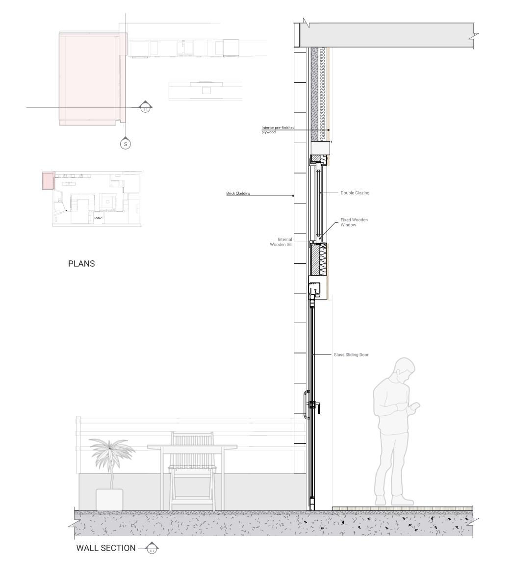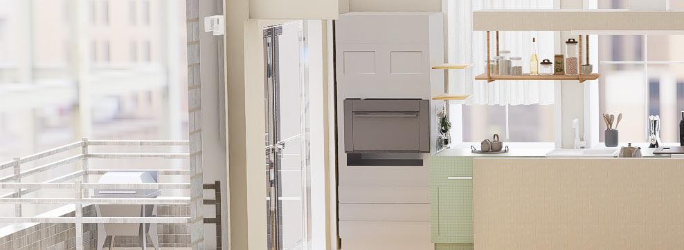 This Kitchen optimizes the morning light through it’s height boasting 14 foot ceilings allowing for optimal visibility of cooking and air flow with the balcony window allowing for food to be cooled and less of a use for air conditioning.