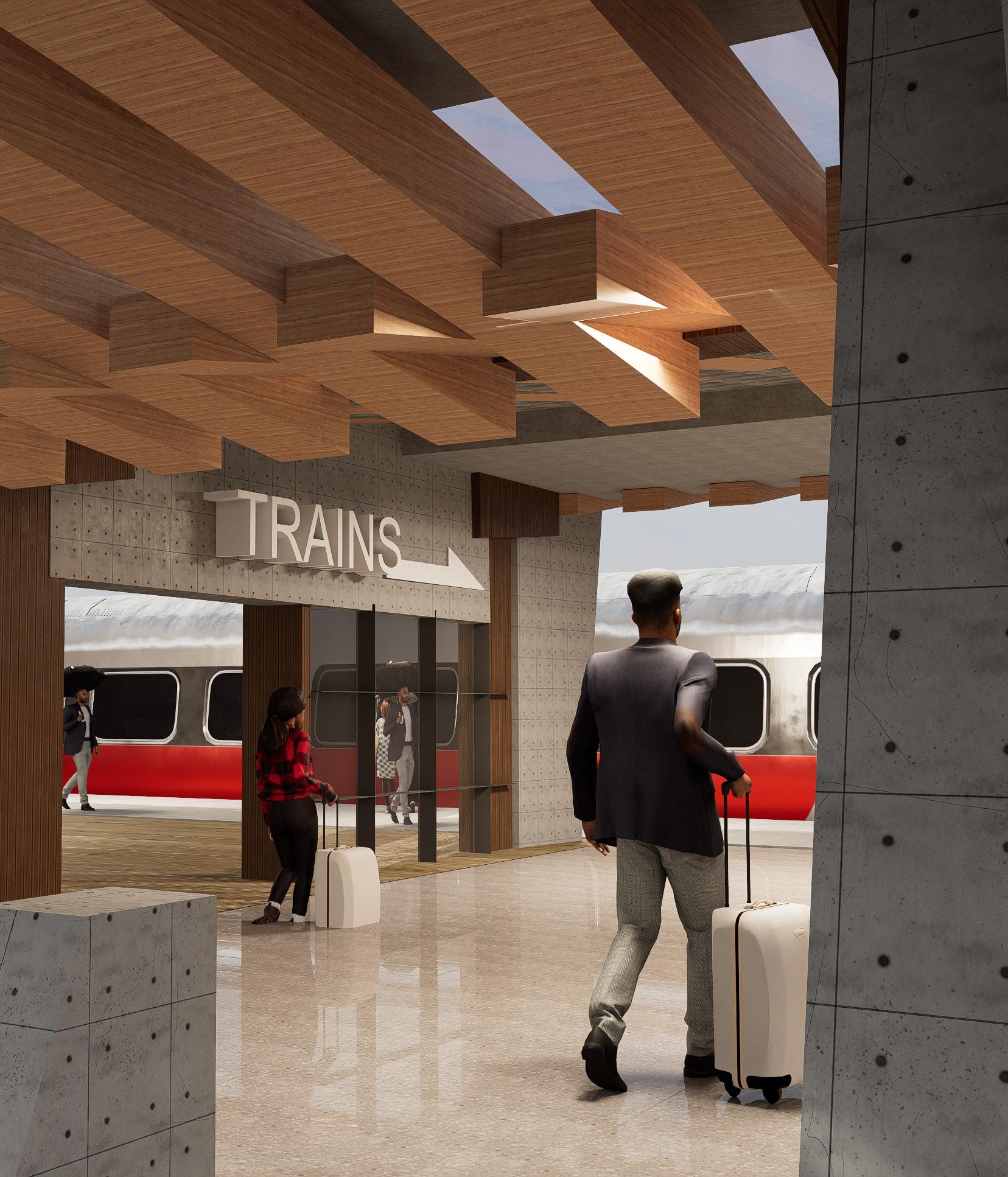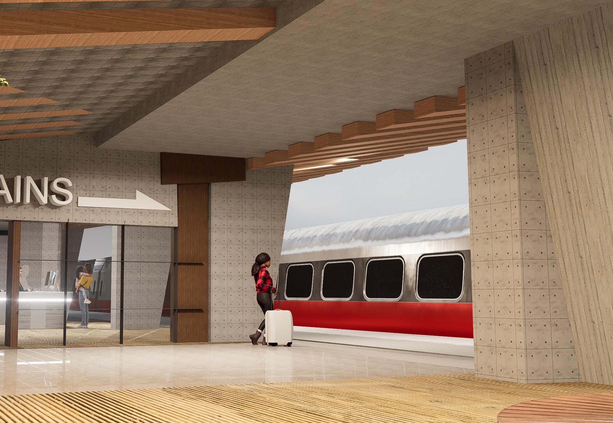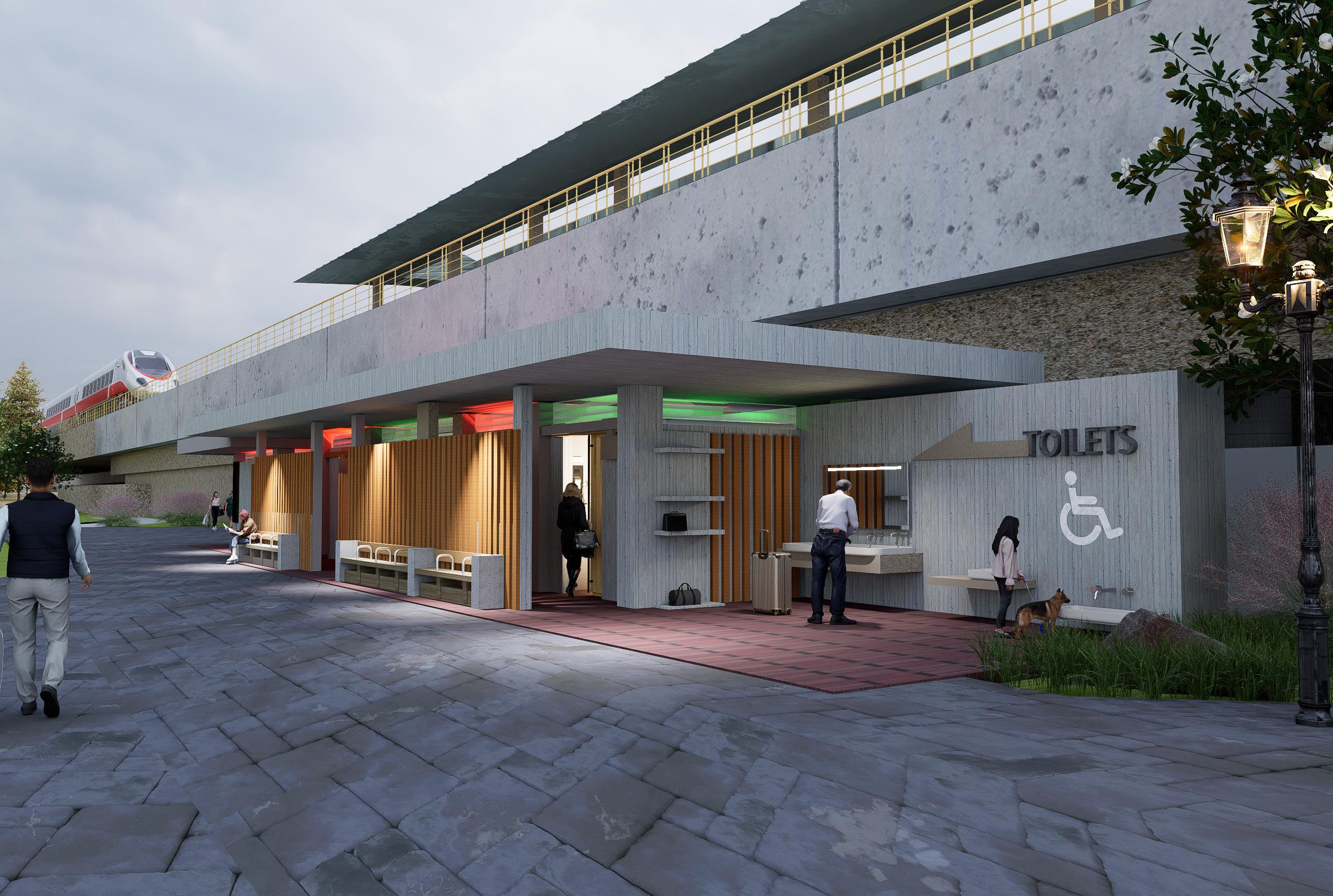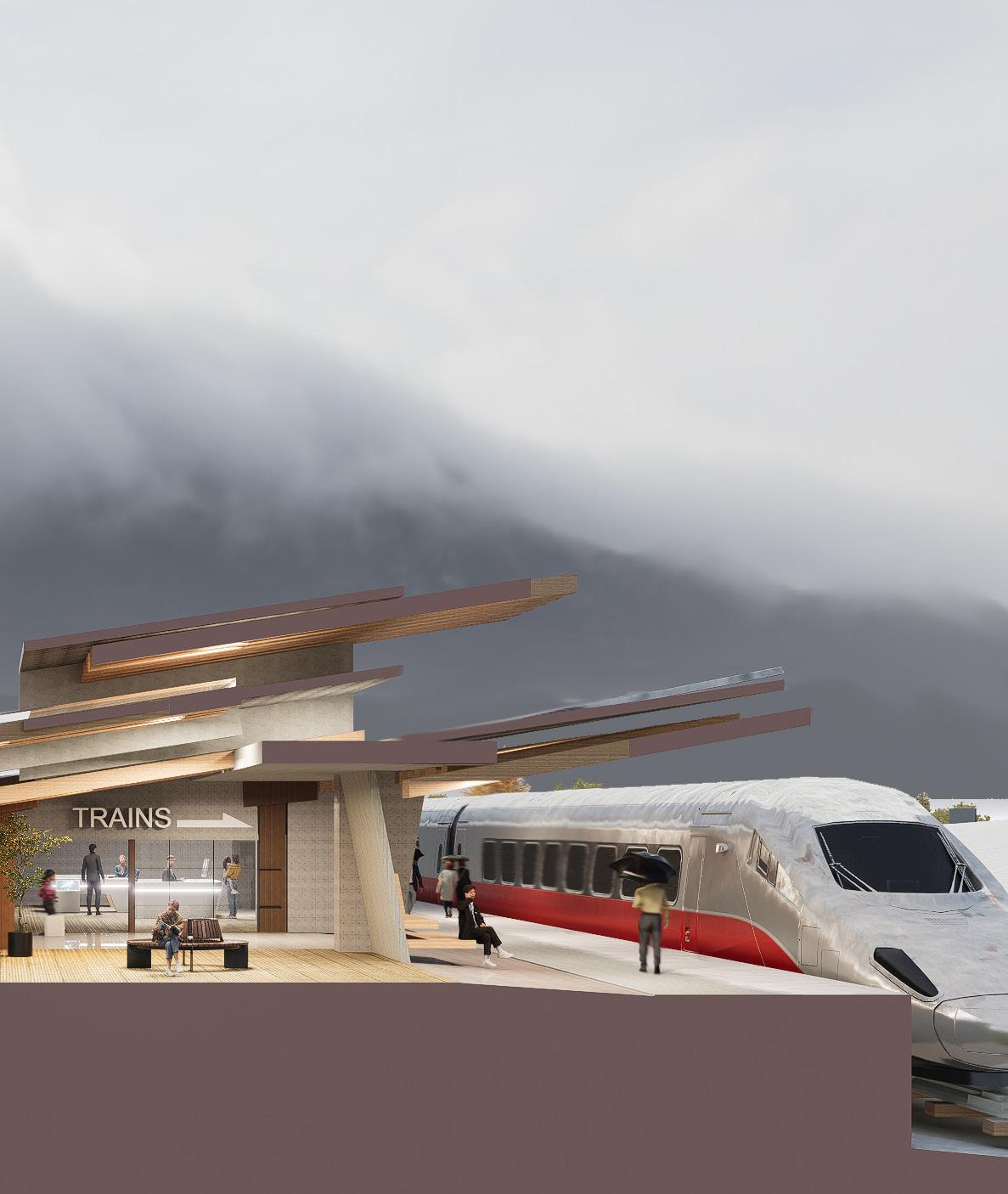 The Cambria Passenger Rail Station embodies clarity in transitioning to a new journey through its slanted tectonics. The station guides passengers seamlessly with interlocking wooden slats, facilitating smooth passage and creating an inviting environment that harmonizes with the natural landscape. Passengers experience continuity and direction, making their travel intimate.