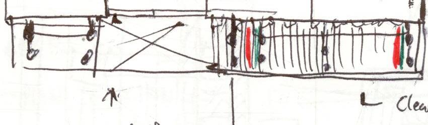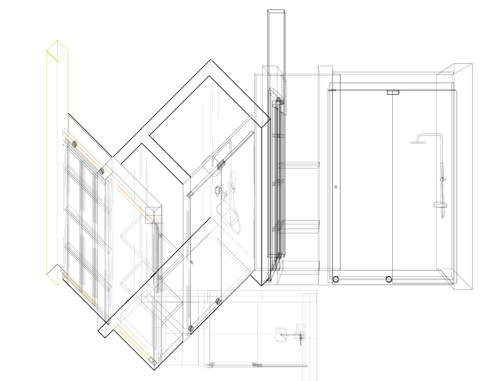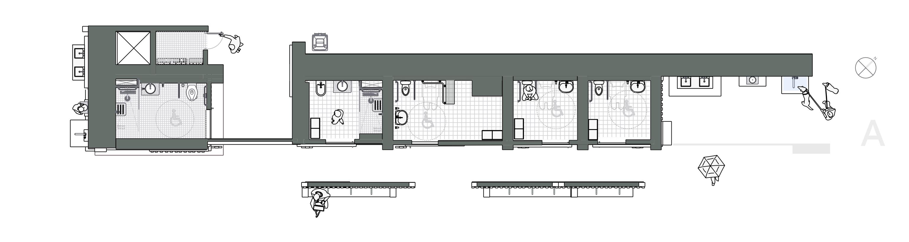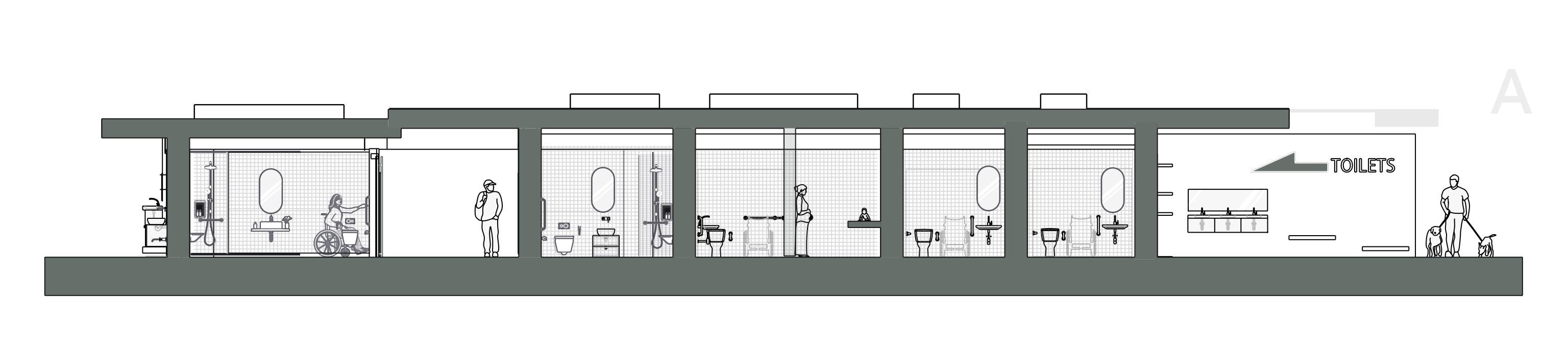 Visibility of availability, each light-well indicates either vacant for green and red for occupied and can be seen from the lot of king street metro and the train platform above. Stalls are equipped with lightweight wooden slat sliding doors that when shut will illuminate said light to indicate to the outside users that the outside closet is occupied.