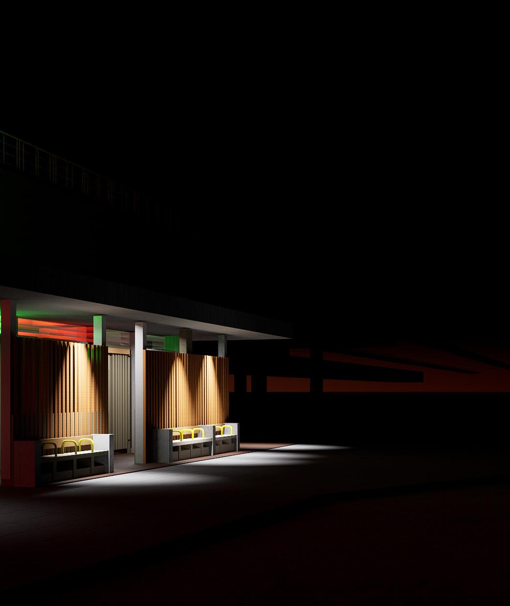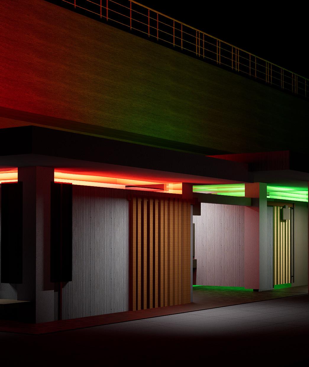 lightwell indicates either vacant for green and red for occupied and can be seen from the lot of king street metro and from the train platform above. stalls are equipped with lightweight wooden slat sliding doors that when shut, will illuminate said light to indicate to the outside users, closet occupied.