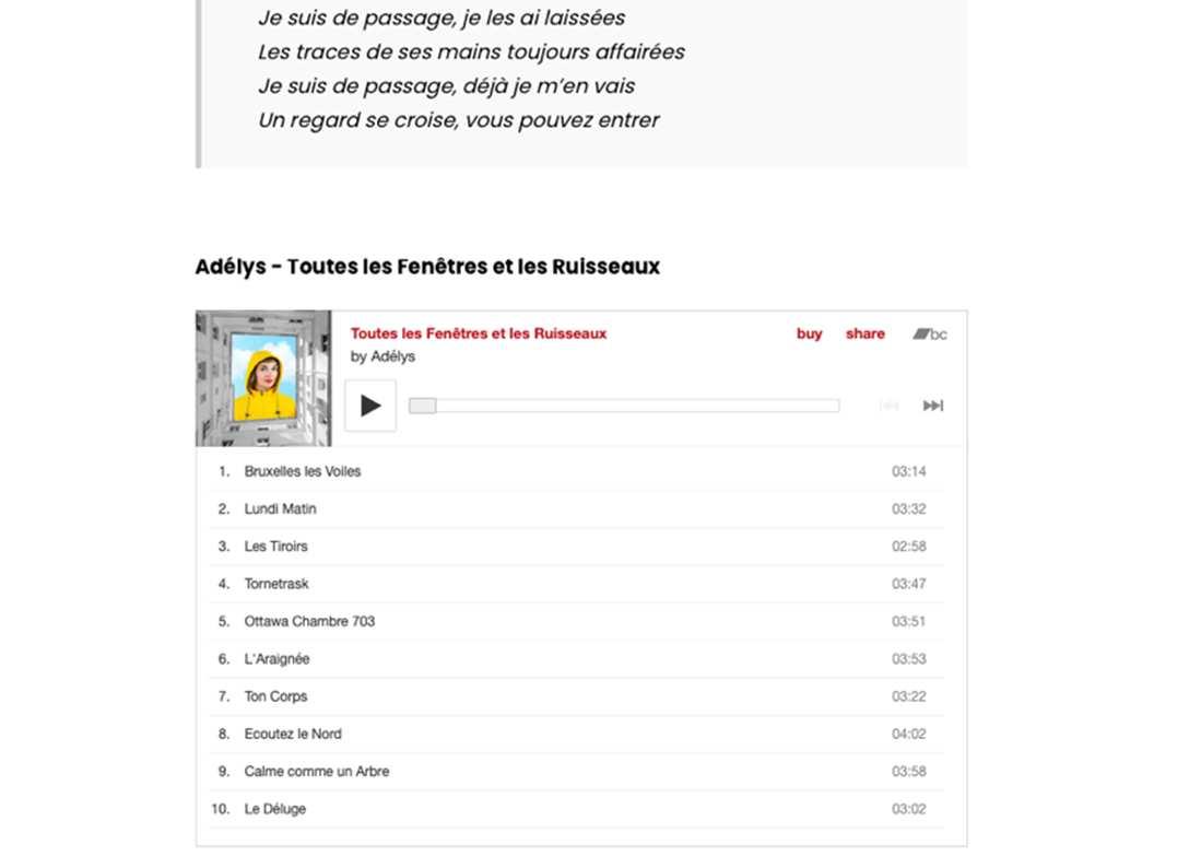 Bruxelles les voiles puis Ottawa chambre 703 en playlist sur Tsugi Radio Toutes les fenêtres et les ruisseaux en playlist sur FIP Nouveautés depuis mioctobre