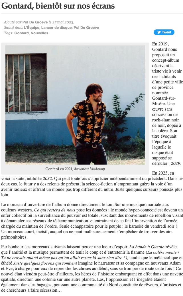 Dans le deuxième volet de son « western social futuriste » - suite de lalbum 2029 sur la fin du monde ouvrier face au capitalisme triomphant -, Gontard, le musicien-lapin le plus subversif de Valence, franc-tireur du parlé-chanté sur samples pop-rock joyeusement barrés, ou « pop SF plutonienne », continue à tisser sa fresque libertaire.