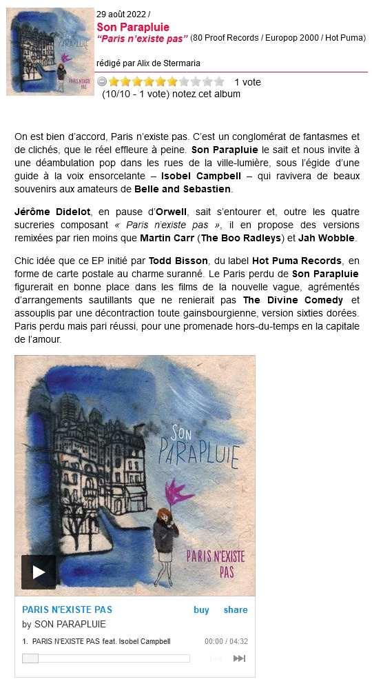 Paris n’existe pas en playlists L’Alternative française (entré N°1) du 03/06/22 au 16/12/22, Variété Française du 29/09/22 au 15/12/22 et New Music Daily (du 03 au 10/06/22). A l’assaut du ciel en playlist Actu Rock de juillet/août 2022.
