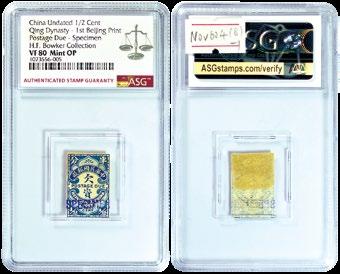 Print Memorial Archway for use in Xinjiang Specimen Stamp Set(3) (5 Yuan, ASG VF/XF85 Mint POG; 10 Yuan, ASG VF80 Mint POG; 20 Yuan, ASG VF/XF85 Mint POG) realized USD 9,600; lot 019 – CHINA EMPIRE 1899 Weihai Port Courier Post Stamp 2 Cents Block of 25 (ASG F/VF75 Mint OG) realized USD 3,120. It is noteworthy that the phone bidder has been purchasing PMG-certified banknotes since 2009, and he has a very positive view of the future of ASG-certified stamps.