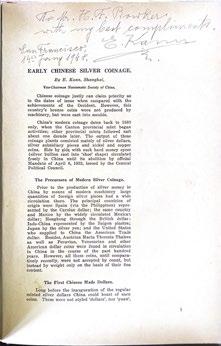 This issue features two articles from prominent numismatists and scholars in the 20th century, Howard F. Bowker's Foochow 1903 and E.Kann'sEarlyChineseSilverCoinage