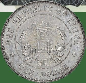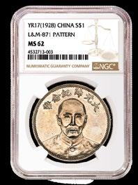 record price of USD 126,000; lot 135 – 1863 Qing Dynasty Tung Chih 5 Tael Gold (NGC MS63), also from the Kann Collection, realized a record price of USD 97,200; the Arthur Coole Collection 1899 Hupeh One Dollar Note (lot 106, PMG Choice EF45) went to an online bidder at USD 67,200, breaking the auction record; lot 169 - 1936 Chiang Kai-shek Spade Half Dollar Lead-Tin Pattern from the J.C. Lee Collection realized USD 12,000.