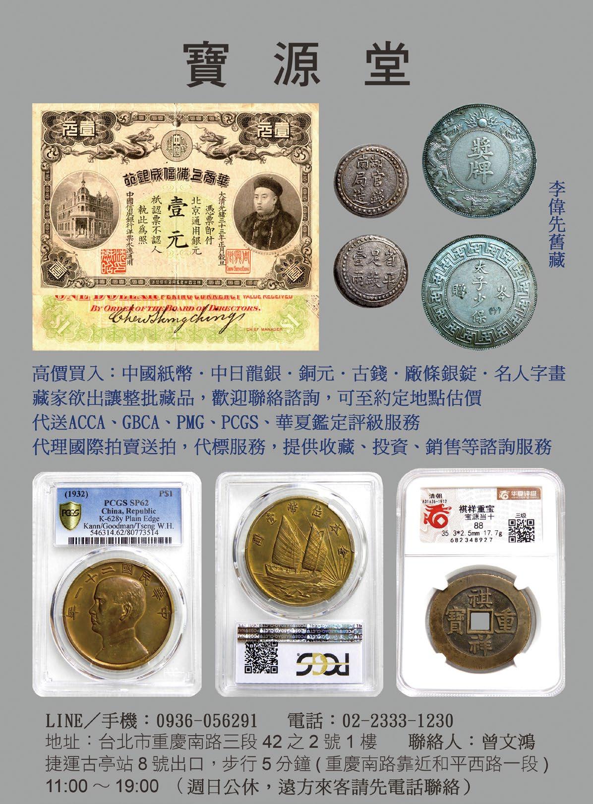 27 600 美元的價格成交,競價主要在中國臺灣買家、美國買 家和新加坡買家之間展開,最終美國買家得標。 其他名人收藏拍品也成績斐然:出自耿愛德舊藏的 LOT 134 - 1871年清代辛未同治十年值念五兩金金幣,背彌勒佛像, 以126 000美元的價格成交;出自耿愛德舊藏的 LOT 1351863年大清同治二年值念五兩金以97 200美元的價格成交; 出自邱文明收藏的 LOT 106 - 1899年湖北銀元局壹大元銀 元票(PMG Choice EF45),被線上買家以67 200美元的價 格競得;LOT 146 - 1899年奉天機器局造光緒通寶當十錢紫 銅幣(NGC VF30)被現場買家以9 600美元的價格收入囊中。 以上三項均打破拍賣紀錄。而出自 J.C.Lee 收藏的 LOT169 - 1936年蔣介石像背布圖半圓錫鉛試樣幣,以12 000美元的價 格成交。