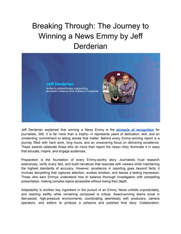 Jeff Derderian is widely regarded as a “Reporter’s Reporter” with more than 20 years of experience in investigative journalism. He has received three Emmy Award nominations, the Edward R. Murrow Award, and numerous Associated Press Awards. His work consistently focuses on breaking essential stories and delivering exclusive reports that have a real impact. Jeffrey Derderian has covered some of the most significant national stories in recent memory. He was one of the first television reporters from New England to arrive at the scene after 9/11 and spent three weeks in New York City reporting on the aftermath. He also covered the Columbine School Shooting and an astronaut's return to space, demonstrating his ability to report clearly during national attention. His work has been featured on national television, including appearances on the Today Show and CNN during coverage of significant storm events. Both colleagues and the public recognize him as a leader in the field of journalism, known for his consistent pursuit of facts and dedication to his craft. Jeff is a freelance investigative reporter at WTNH-TV in New Haven, Connecticut, covering stories for the Hartford market. One of his recent Emmy-nominated reports, “How Technology Is Changing How Emergency Responders React,” explored a new real-time video technology developed by three former Yale students. The system, accessible to municipalities across the country, has shown strong potential despite being in Connecticut's early stages of use. His investigative work has contributed to real-world change. A story he reported on the murder of a visiting nurse led to legislation improving safety for nurses and home healthcare workers in Connecticut. Derderian continues to focus on stories that bring attention to public issues, expose wrongdoing, and push for accountability.