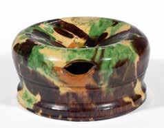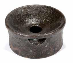1151. NEW MARKET, SHENANDOAH VALLEY OF VIRGINIA EARTHENWARE / REDWARE DIMINUTIVE / LADY’S CUSPIDOR / SPITTOON, lead- and manganese-glazed with “bubbled” surface, circular, slightly tapering form with concave center, D-shaped cut-out drain hole below rim, and some glaze splotches to base. Possibly John G. Coffman (1803-1889), New Market, Shenandoah Co., VA. Mid 19th century. 1 5/8” H, 3 1/2” DOA.