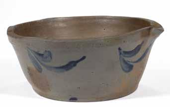 1164. BALTIMORE, MARYLAND DECORATED STONEWARE MILK PAN, salt-glazed, approximately half-gallon capacity, low conical form with squared rim and pouring spout. Brushed cobalt tri-foliate design repeated four times below rim. Circa 1875. 4” H, 9 7/8” DOA (including spout).