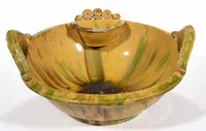 ARTICLES, LOT OF FIVE, comprising a double lead-glazed small dish of shallow slanted shoulder form with rounded rim and clamshell-like cut-off lines to the partially glazed base, a small flower pot saucer, two pipe bowls, and a wooden potter’s rib used by Schweinfurt. The pottery of John George Schweinfurt (1825-1907), New Market, Shenandoah Co., VA. 1860-1907. Dish: 1 1/2” H, 6 1/2” D. Saucer: 1” H, 5 1/8” D. Rib: 5 3/8” x 3 1/8”.