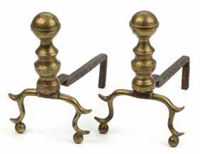 1029. AMERICAN LATE FEDERAL PAIR OF MINIATURE BRASS ANDIRONS, each threaded and seamed column topped with a ringed-ball finial, raised on scrolling legs with spurs and ball feet, original wrought-iron log supports. First quarter 19th century. 5 3/4” HOA, 7 1/2” LOA.