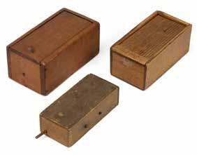 1015. VIRGINIA WOODEN SLIDE-TOP BOXES, LOT OF THREE, comprising a push-pull slate friction turkey call with “Isaac” and other inscriptions on the top; a square-nailed pine example with illegible inscriptions to one side and under the top; and a wooden-pinned pine example inscribed “Property of Robt A. Bowers, Brandy Station, Culpeper Cty, Va.” and dated 1844. Each with an old or original natural surface. Mid 19th to early 20th century. 3 1/4” H, 7” x 2 7/8” OA.