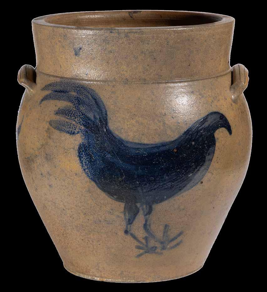 1142. STRASBURG, SHENANDOAH VALLEY OF VIRGINIA DECORATED STONEWARE JAR, salt-glazed, “3” gallon capacity mark, ovoid form with high, slightly flaring collar and plain rim, heavy, beaded neck ring, and applied arched handles. Brushed cobalt dropped tassel-style decoration from neck to each side. Attributed to the Keister family pottery, possibly in conjunction with Jacob and Joseph Eberly (1874-1877), Strasburg, VA. 1850-1877. 13” H, 8 5/8” D rim.