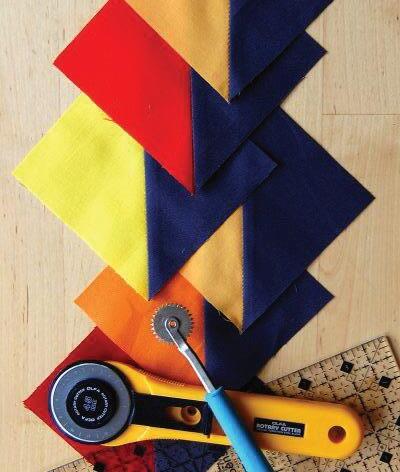 A scenic border print (the palm trees) is highlighted with pieced log cabin blocks in this intriguing lap quilt. The use of an ombre border print for the sashing pieces creates some added dimension. Lap size is 50” x 62 3/8”.