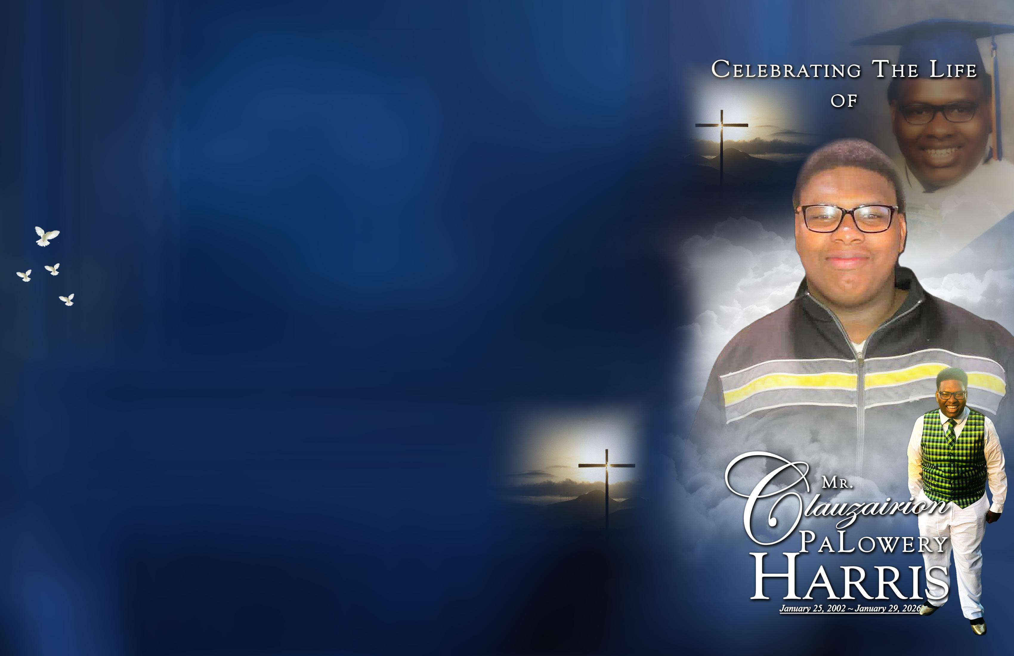 Clauzairion Palowrey Harris (Clauz) was born on January 25, 2002, to Valerie Harris and Claude Lowery in Memphis, TN. On January 29, 2026, Clauzairion departed his life in exchange for eternal life with Christ. Clauzairion was a resident of beautiful Marana, AZ and he desired to grow old in AZ.