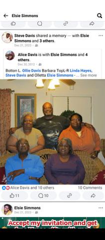 So little sister, baby sister and adult independent woman too, I miss our phone calls late on Saturday nights. Several times since you left, I find myself going to the phone to call you only to remember that you are no longer here. When you first left, I could picture our mother greeting with hugs and kisses and saying, “my baby”. I could picture our brother Sonny looking at you and saying, “hi Squeak”. Then I could see Joyce being herself and saying, “Olletta what the hell are you doing here?” Finally, Olletta, I visualize our Daddy just quietly standing there with a smile on his face. So when I think pf you Olletta, I am consoled by knowing you are safe with those who love you.