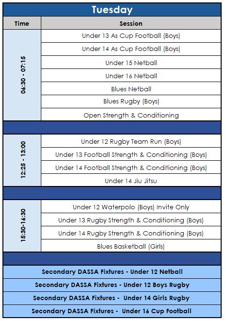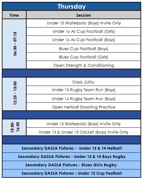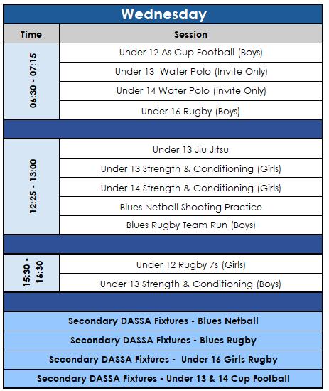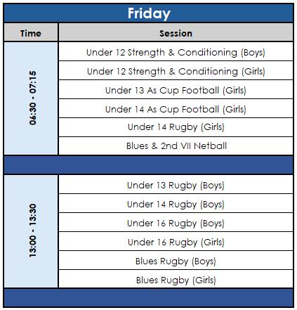 Please note that training schedules may be subject to change due to fixture updates, weather conditions, Ramadan or other operational requirements and reducing intensity where necessary All communications regarding changes will be made directly with students