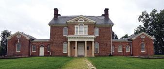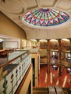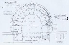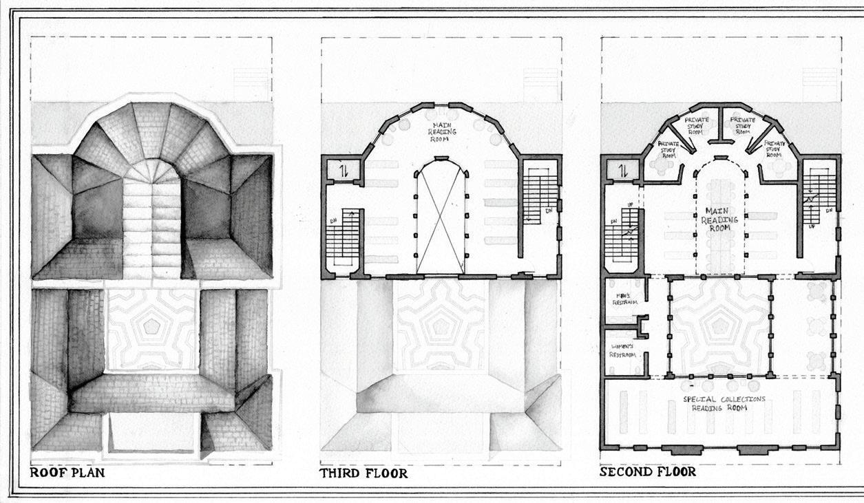 The back of the library building features a large, two story reading room. A smaller special collections library room is located to the front of the building on the second story.
