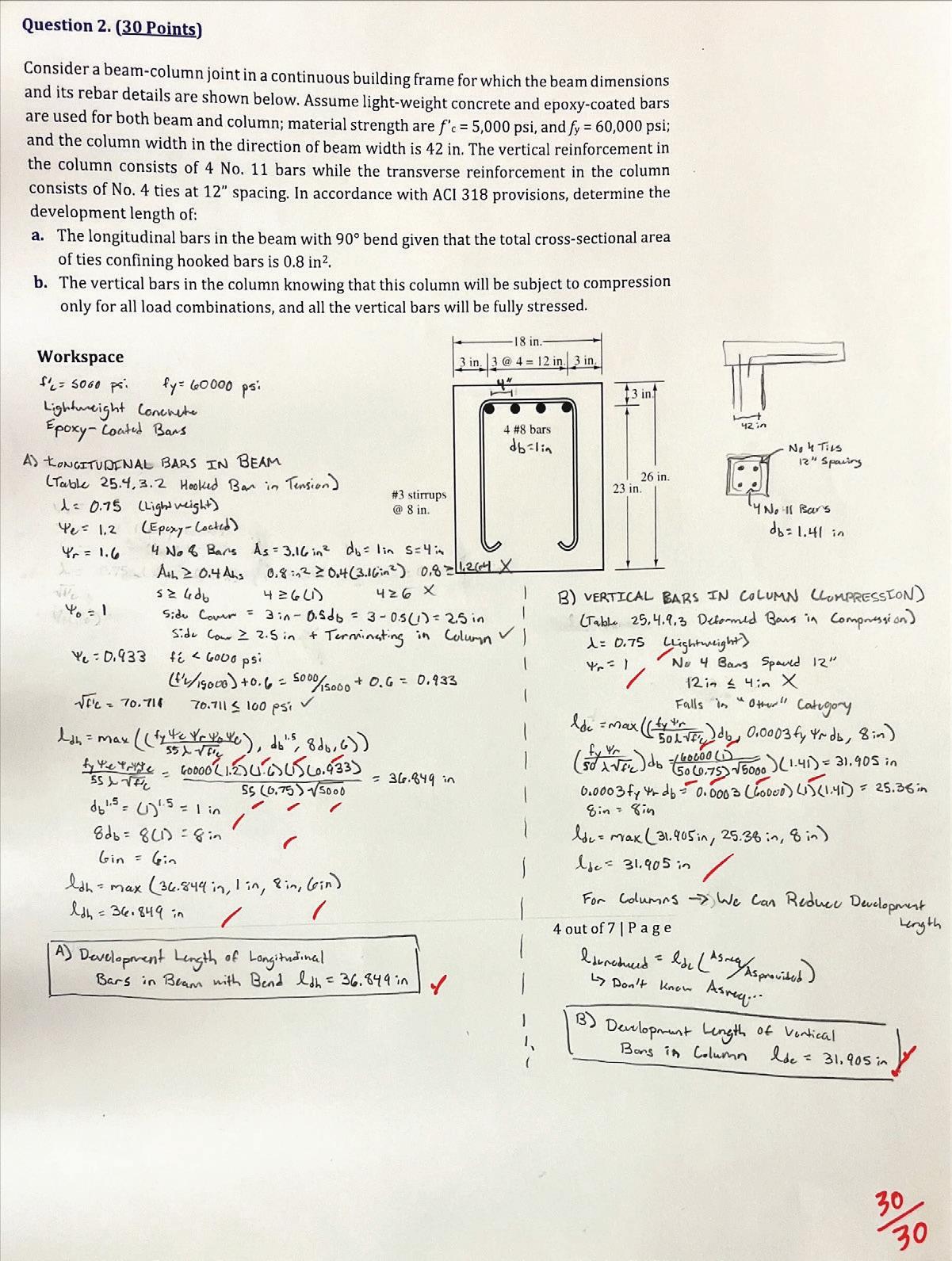 The second problem asks for students to determine the development length (distance which rebar has to be embedded in concrete in order to maintain maximum strength characteristics) for a reinforced concrete beam-column connection.