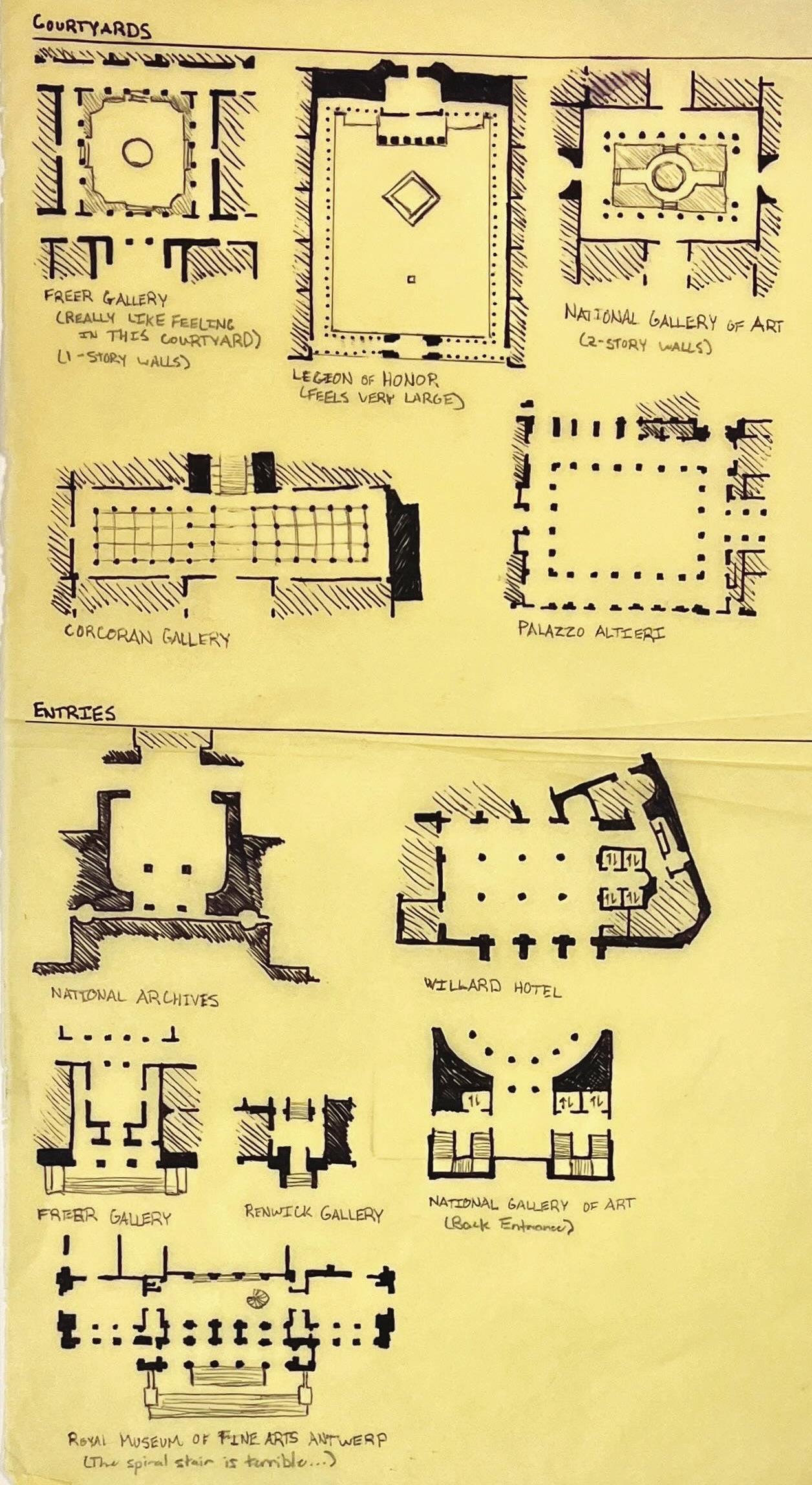 I then spent time examining each precedent with trace paper and poche and diagramatic analysis. After studying each precedent, I created trace paper “menus” comparing the ways my different precedents addressed spaces like coutryards, entryways. art galleries, and grand staircases. (“Menus” shown on right.)