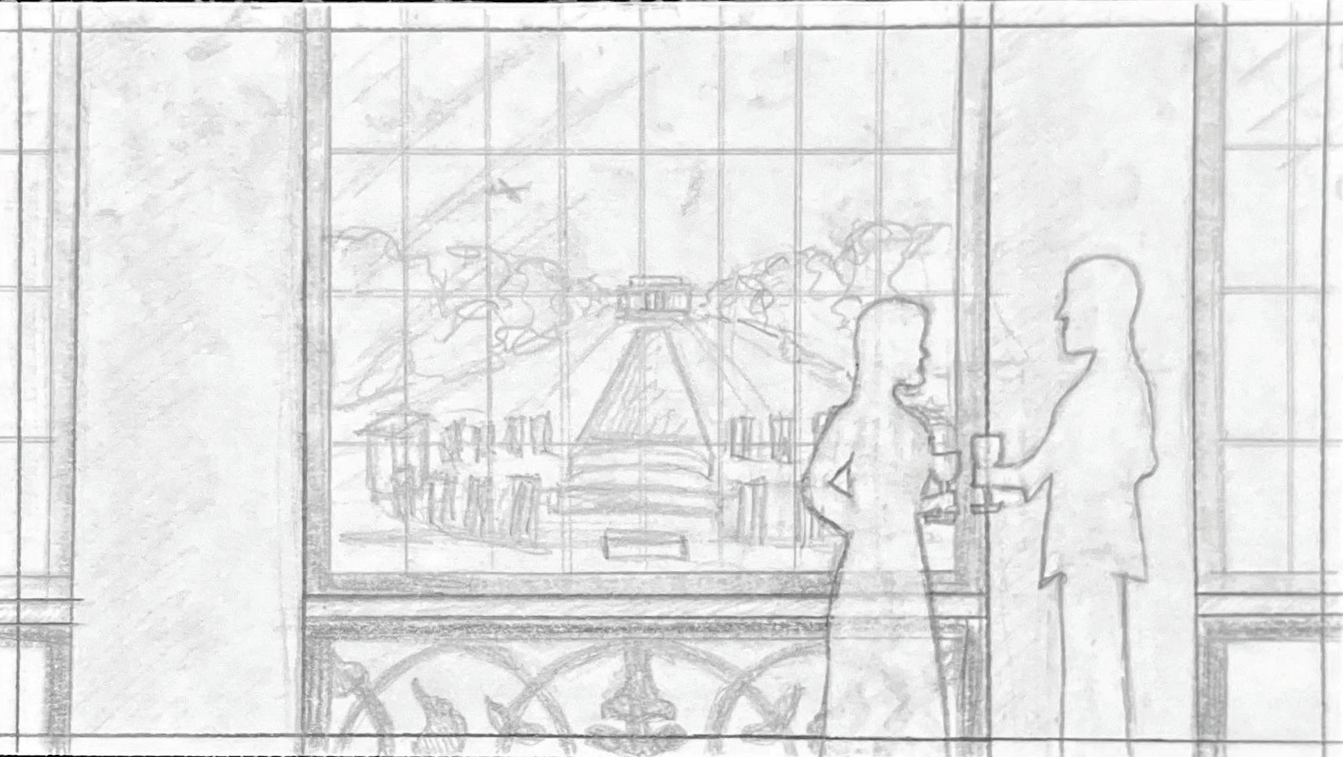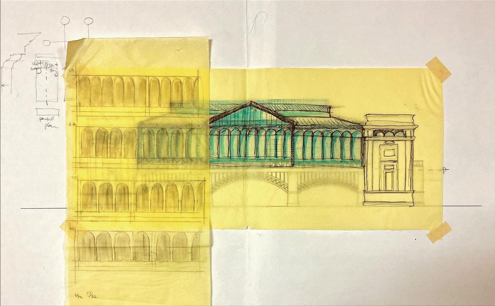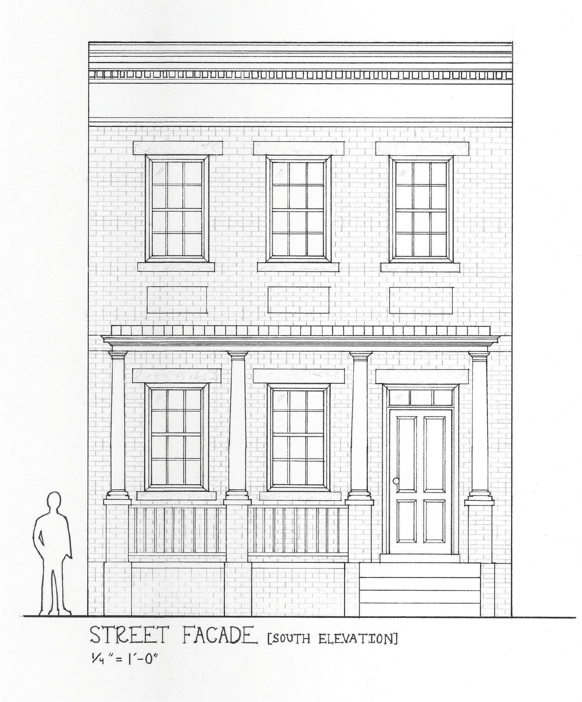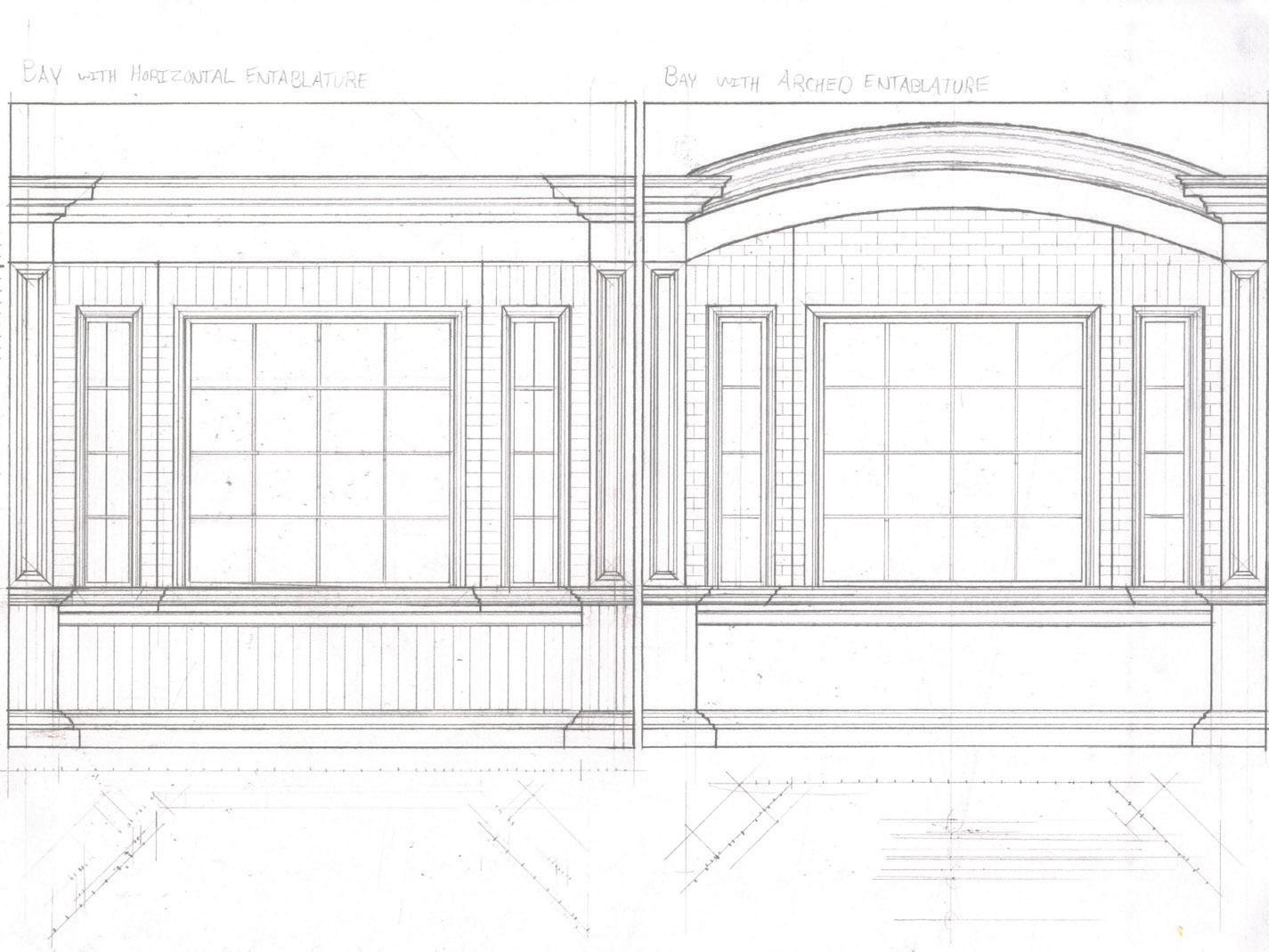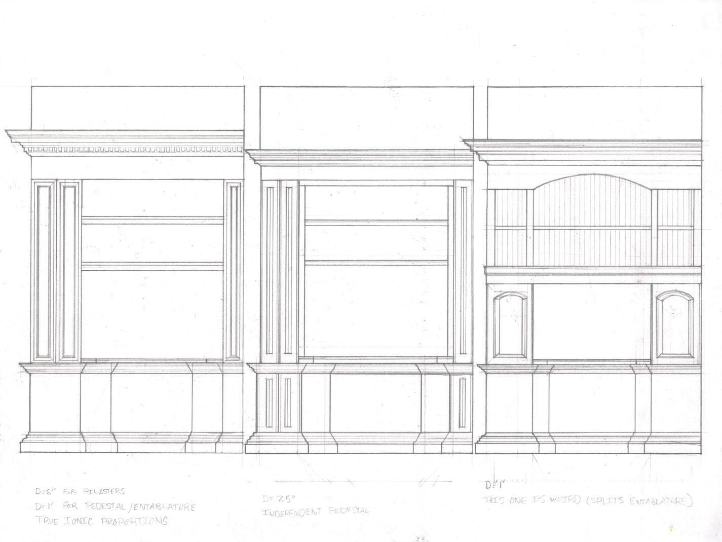 I also drafted a comparative drawing to determine if a flat entablature or a segmented arch entablature made more sense over the center window, ultimately determining that a flat entablature felt more comfortable in that space.