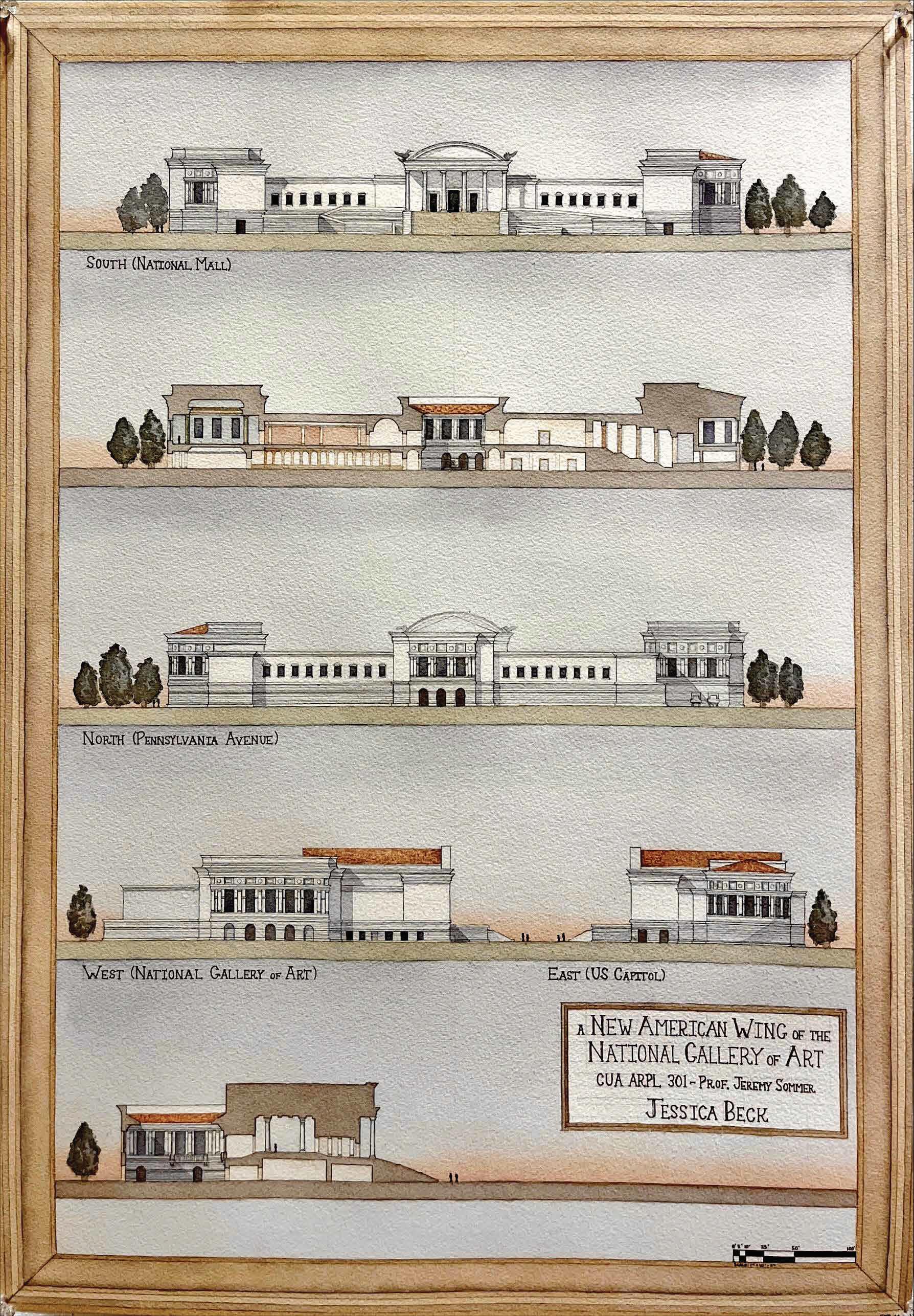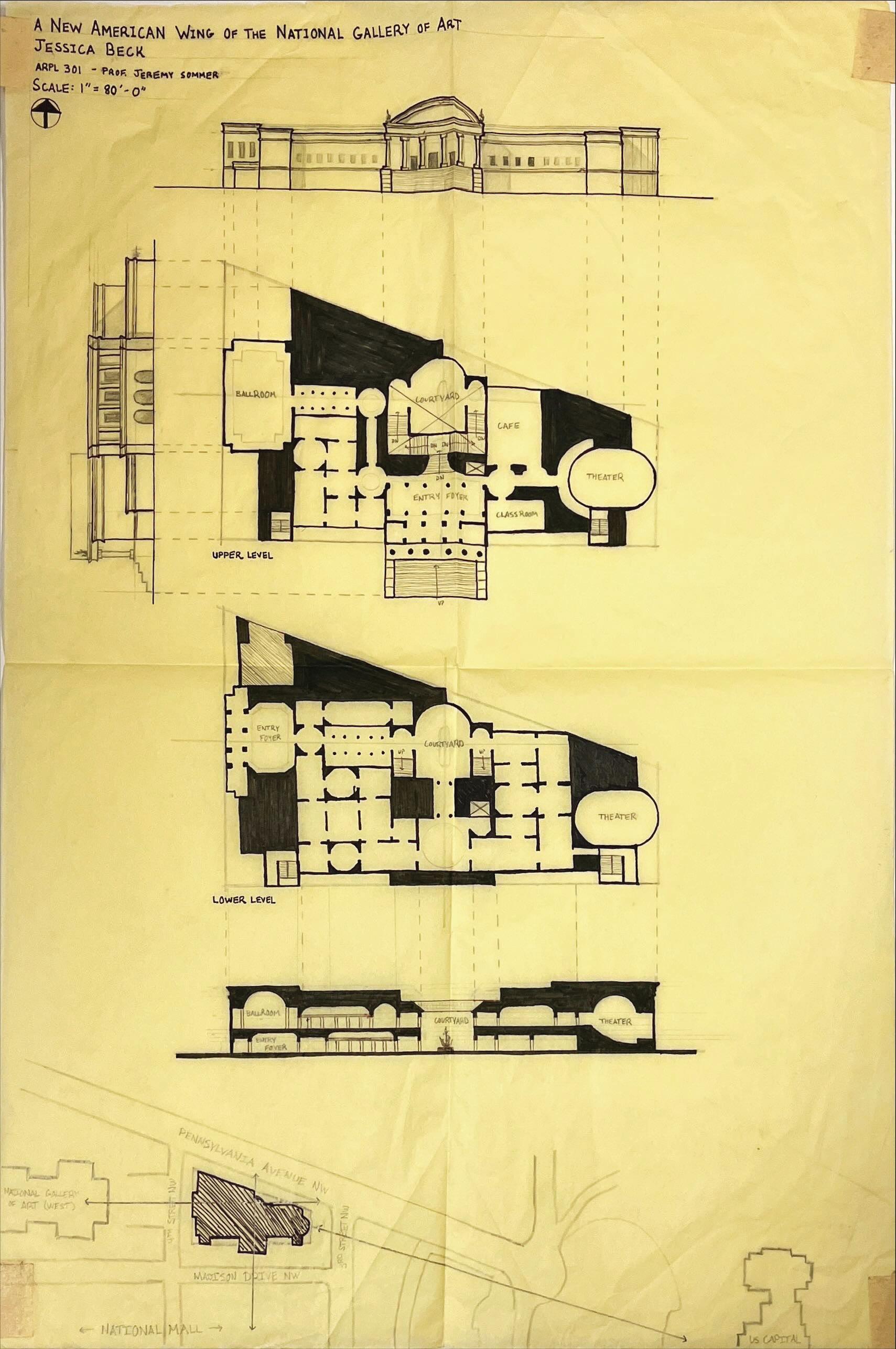 Students were tasked with imagining that before I.M. Pei designed the East Wing of the National Gallery of Art on the Washington, DC National Mall, we were approached instead to propose a museum design that compliments the existing John Russel Pope National Gallery of Art building and fits well within the civic monumentality of the National Mall. In addition, students were challenged to address the French Hotel Problem: to fill the entirety of an irregular site with regular interior spaces by carving rooms out of the poche and using “knuckle spaces” to turn visitors from one axis to another.