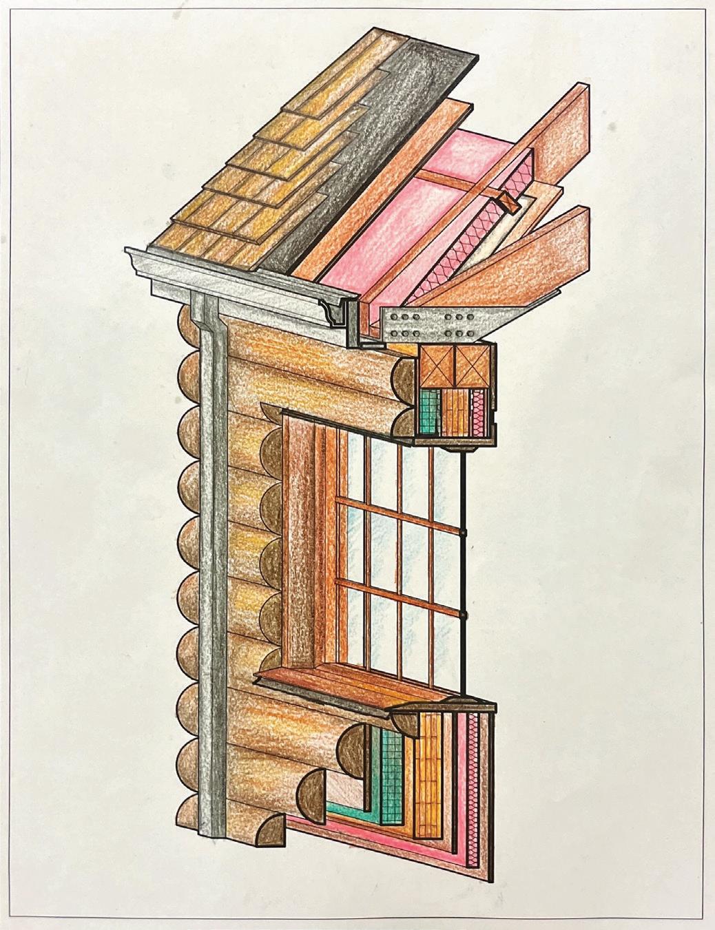 I choose the typology of a log cabin. The exterior of the traditional and contemporary bay details are aesthetically identical, but the traditional wall uses notched log construction while the contemporary wall uses mass timber wall panels faced with a semi-log exterior finish. The six details and the axonometric mock-up rendering illustrate how modern materials are layered in the contemporary wall section, floor sandwhich, and roof aseembly.