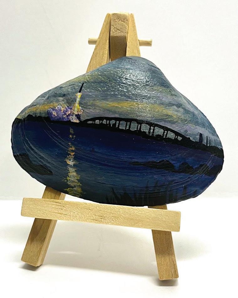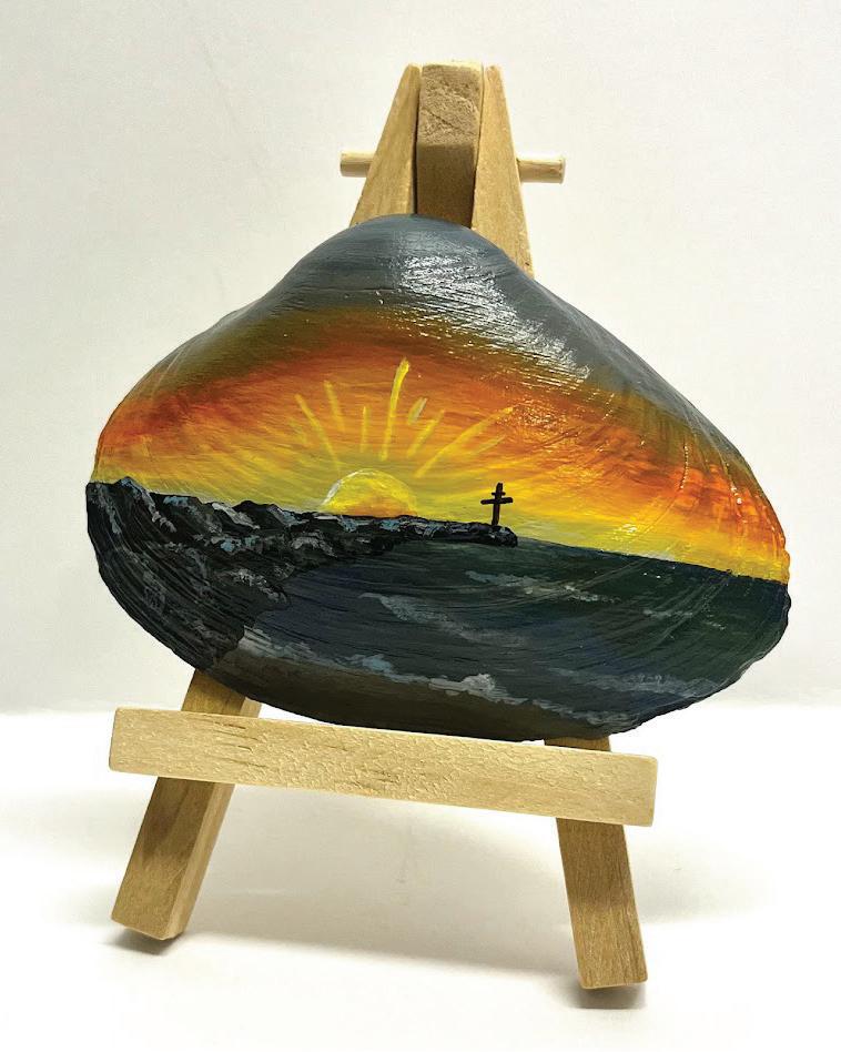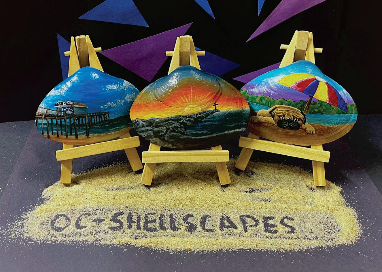 I named the business OC-Shellscapes. “OC” stands for Ocean City, Maryland, my hometown and the beaches were I collect my seashells. “Shellscapes” is a term I invented to describe that my favorite subjects to paint on seashells are landscapes.