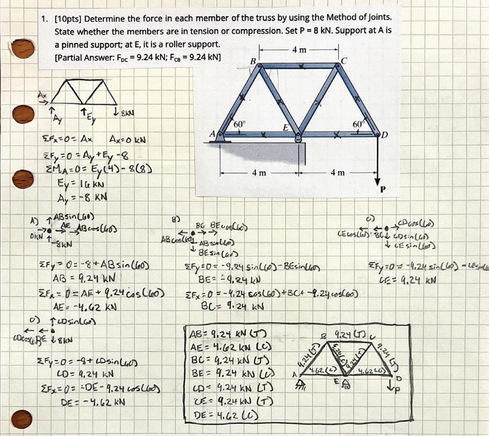 Students were tasked with solving for the internal forces and reaction forces of a truss to identify which members of the truss are in tension, compression, or zero-force. This course addressed how to solve for beam, truss, and frame forces with hand calculations and also how to use SAP2000 (a structural design and analysis software) to calculate the forces in a structure.