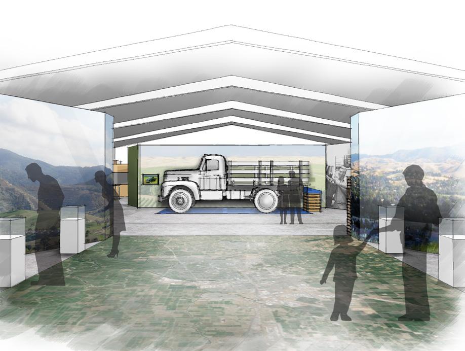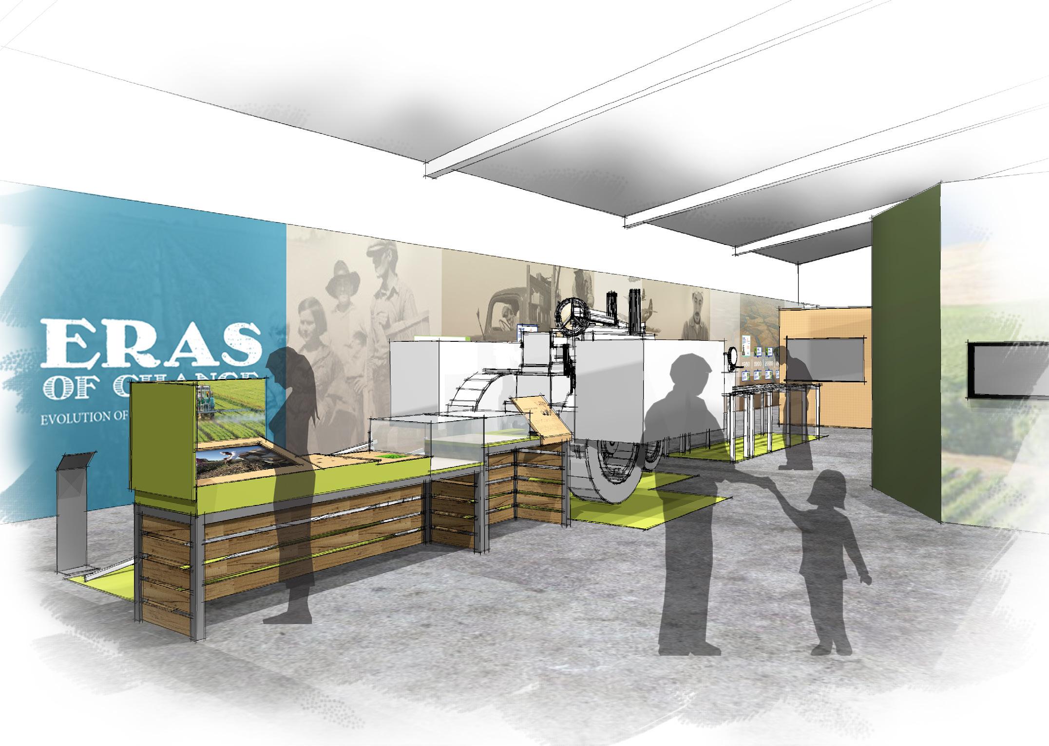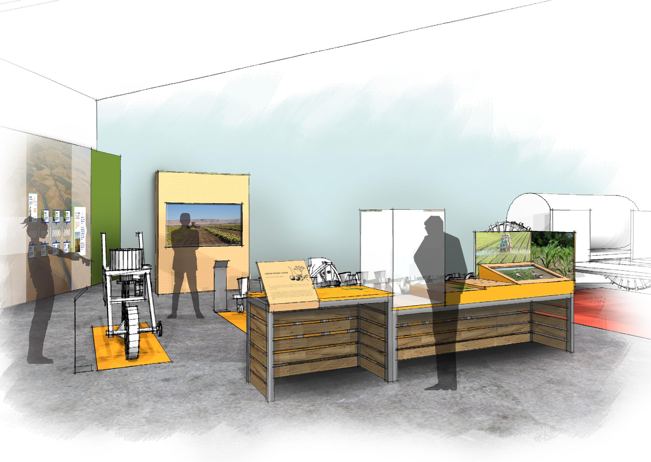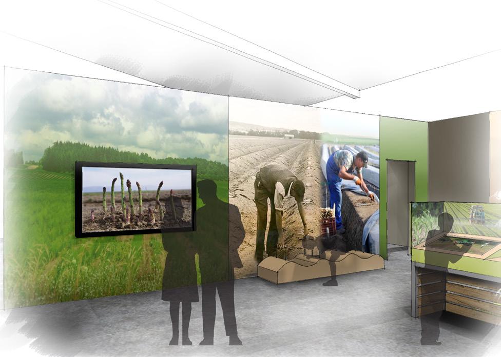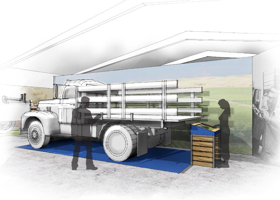 3.1-3.5 EXHIBIT CLUSTERS INTERPRET THE STORY OF THE FIVE CROPS; CHERRIES, ASPARAGUS, TOMATOES, WALNUTS,BEANS AREAS ALLOCATED FOR AV