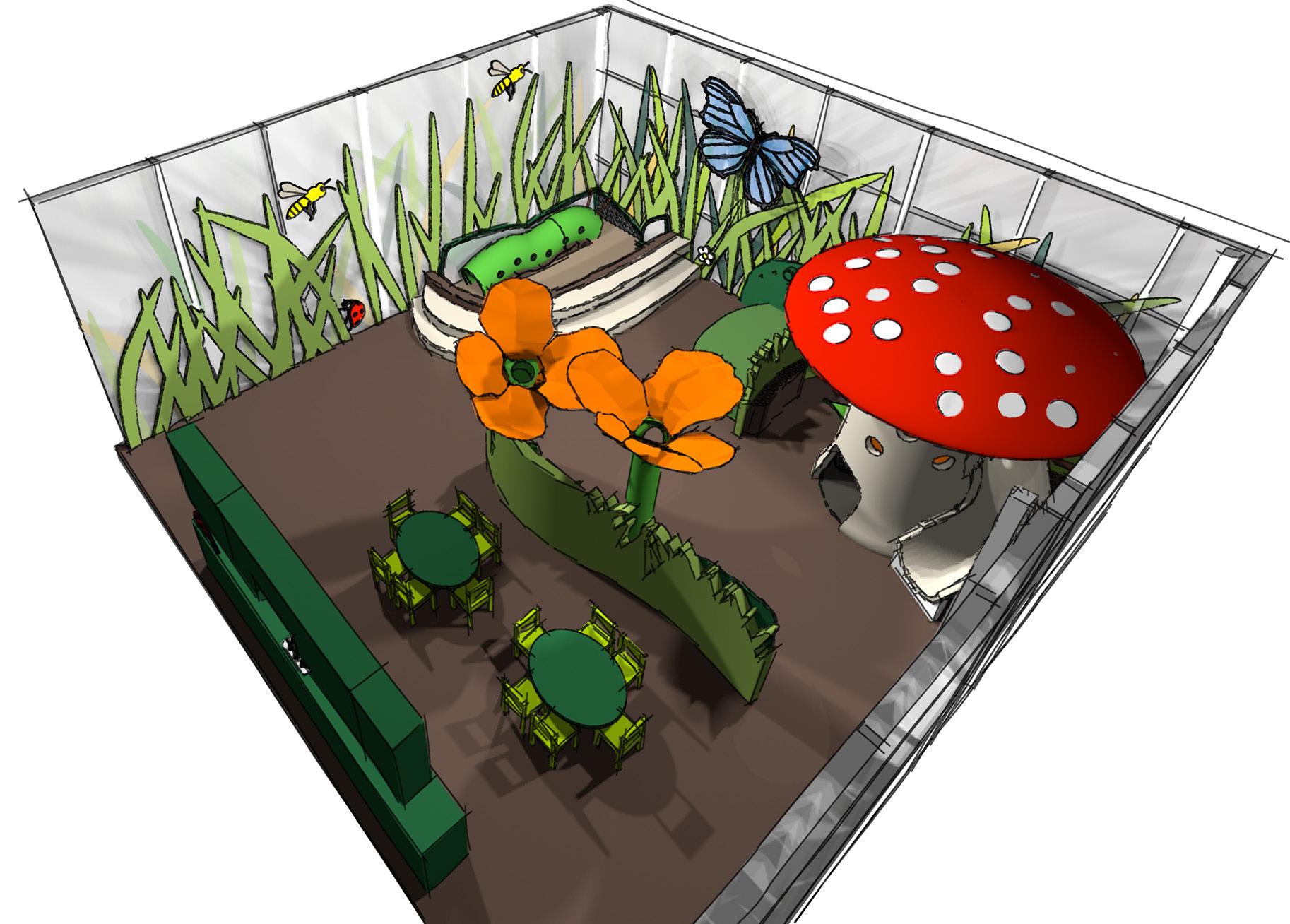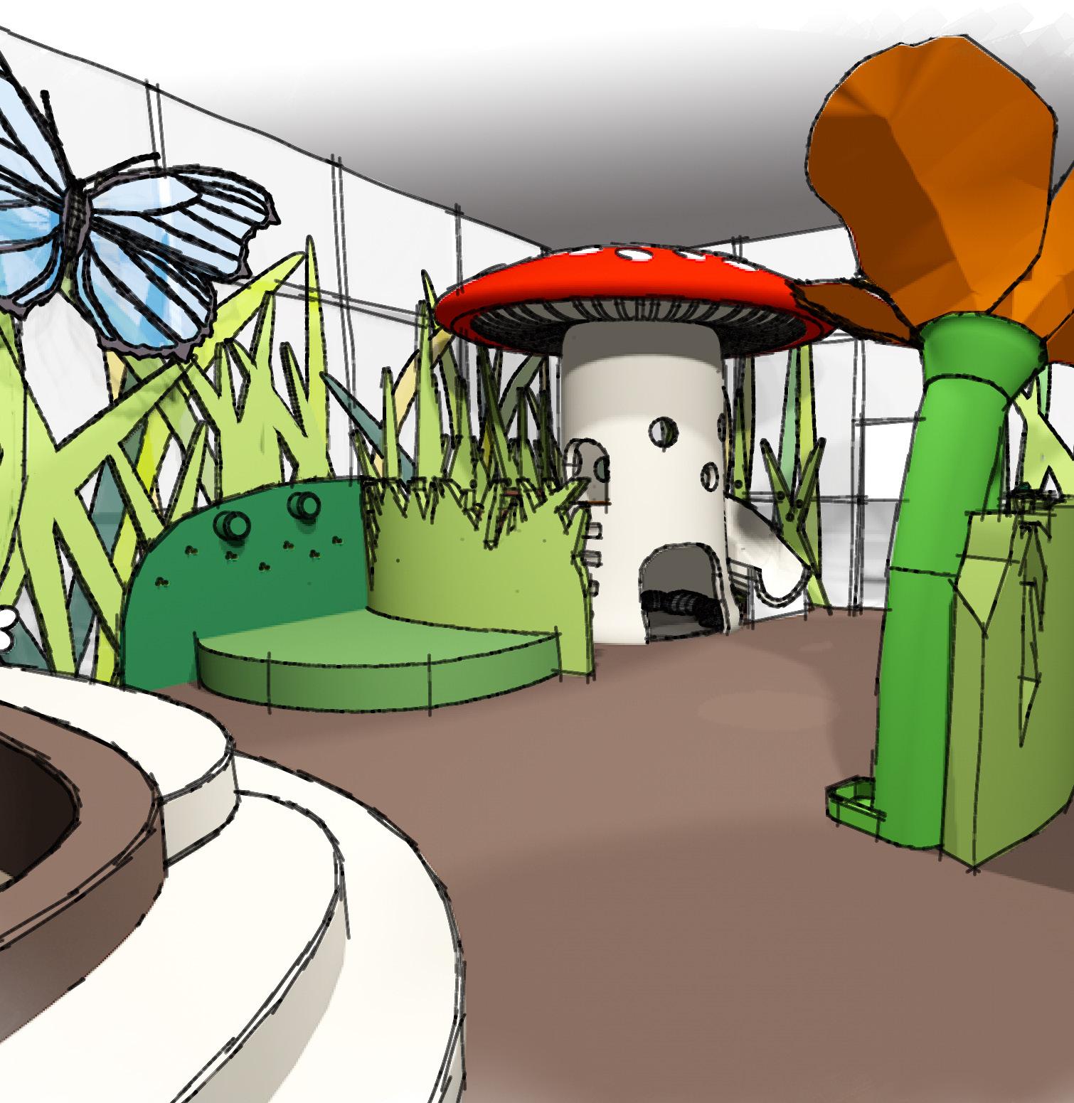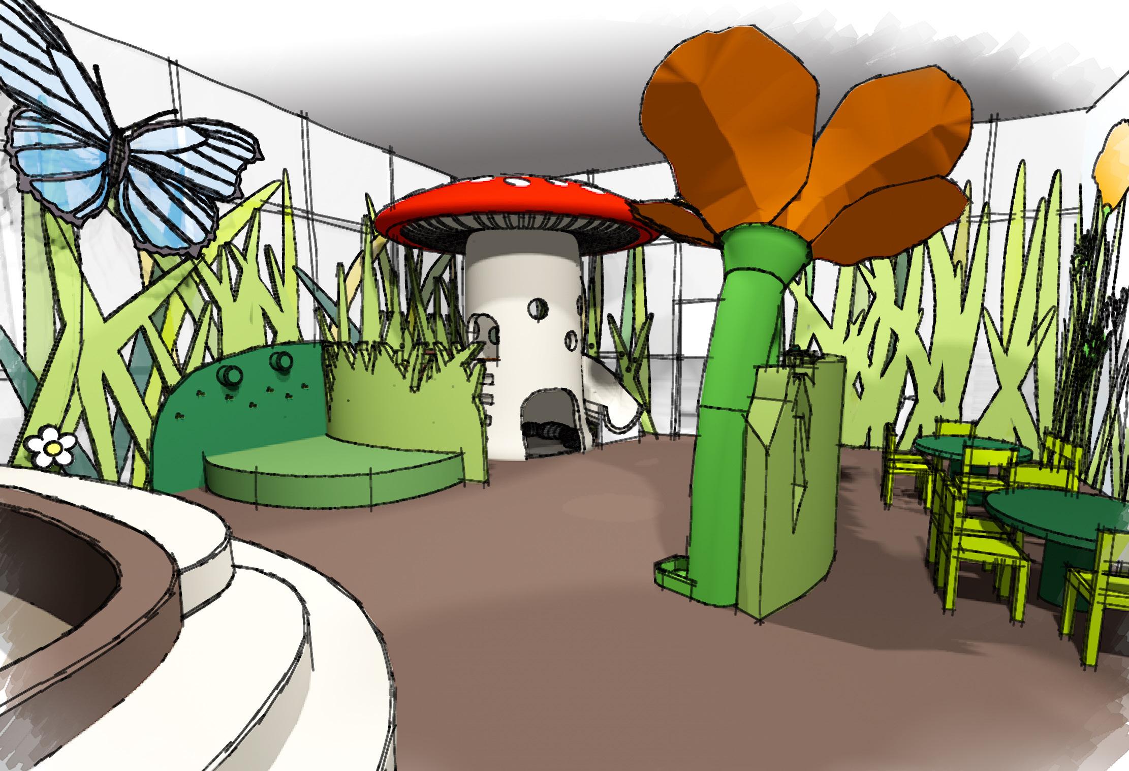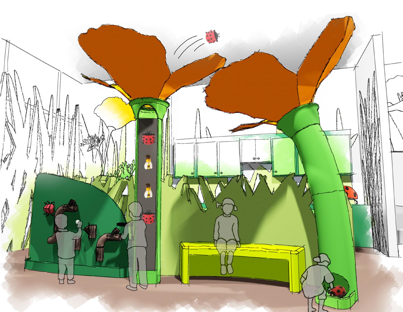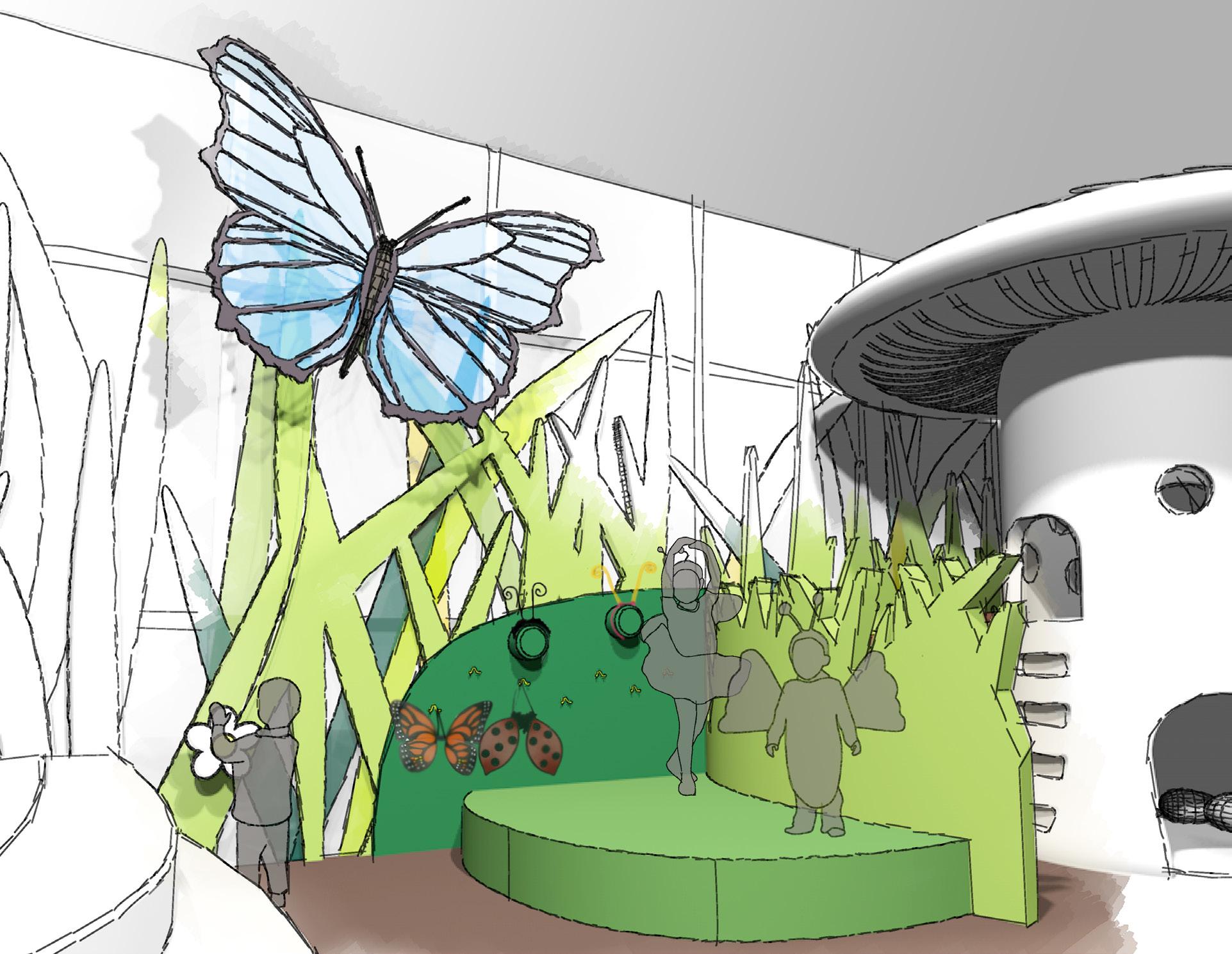 This is an area where children can dress up with insect costumes and turn a crank to make the butterflies wing flutter. Imaging stories and acting them out encourages creativity and teaches children how to communicate with others.