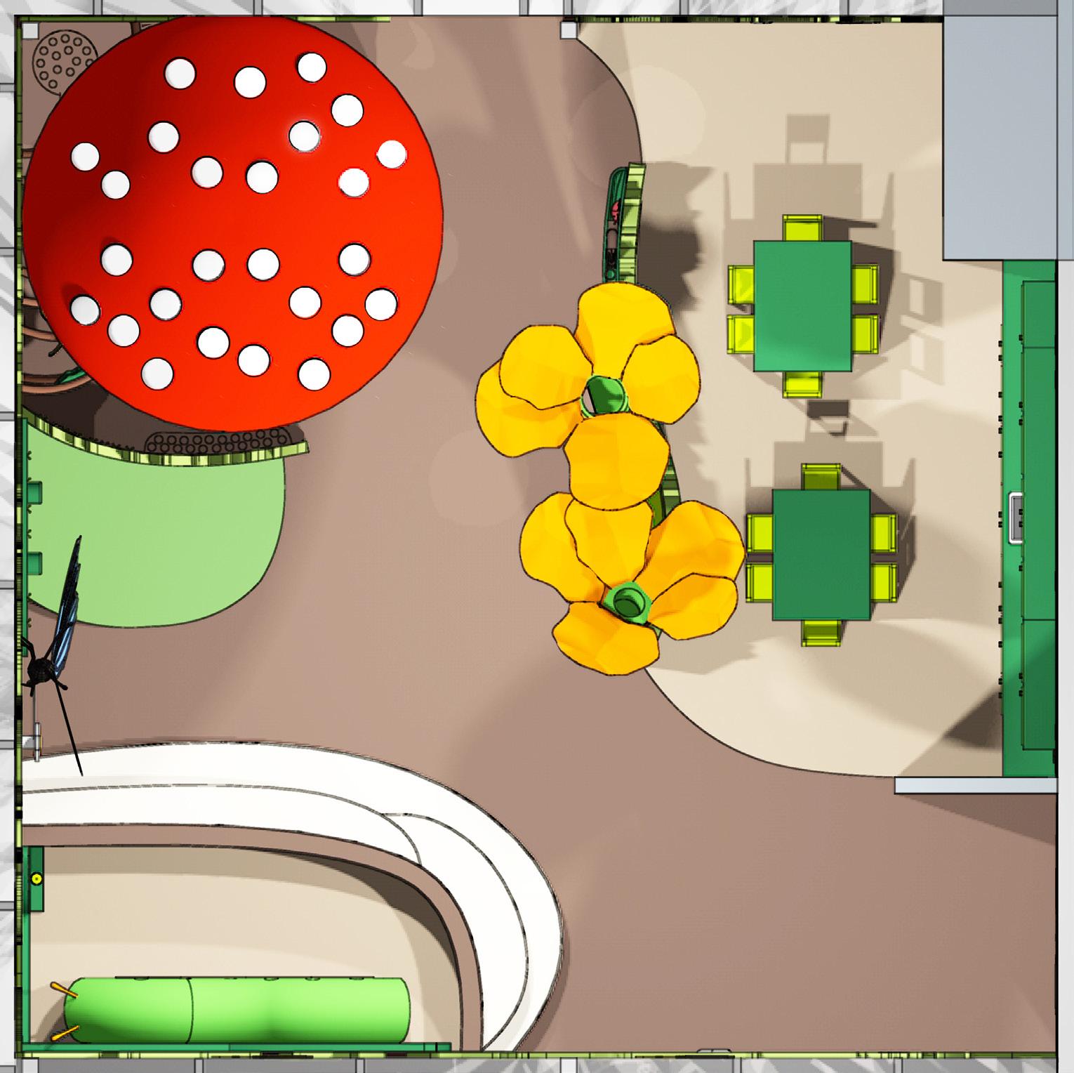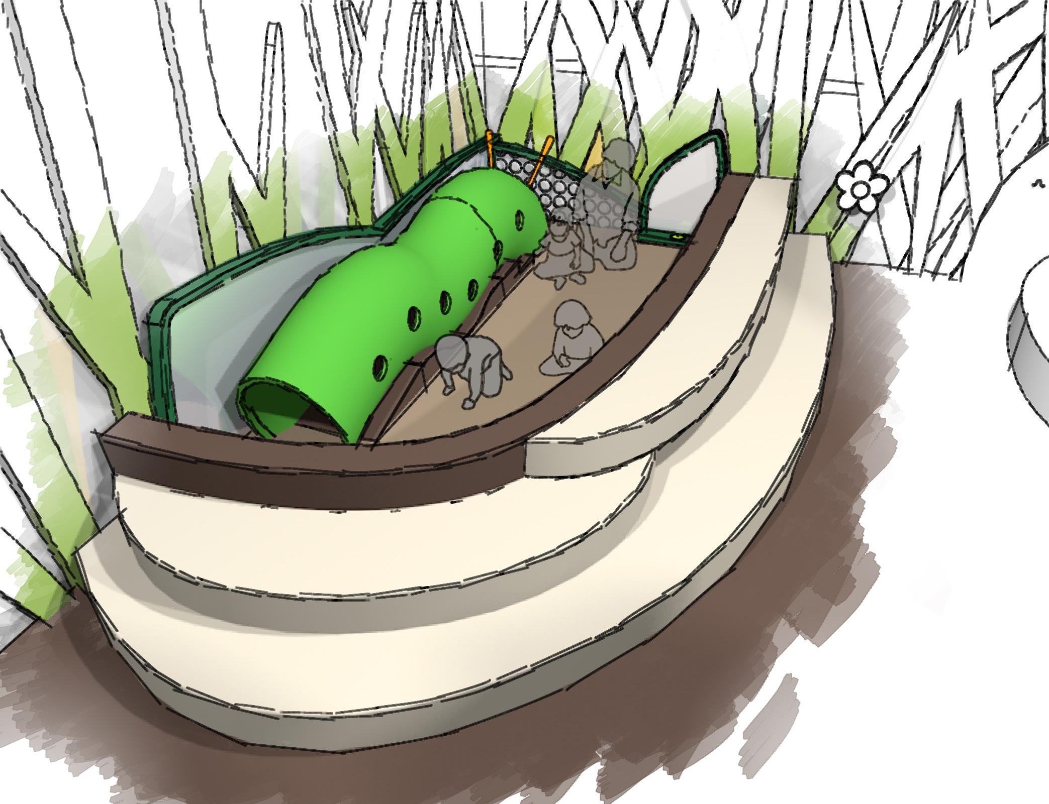 This is a sunken area designated for infants and toddlers crawling or just beginning to walk. Tree trunk inspired, the lichen-like steps provide seating for parents and guardians.