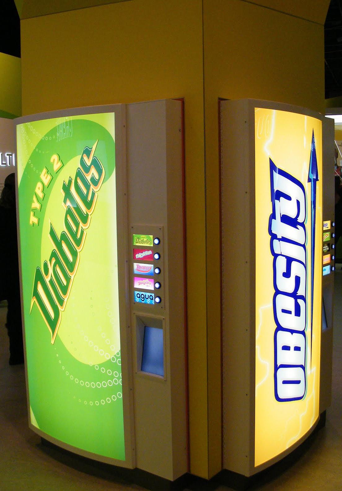 The front of each vending machine shows a logo that resembles a major soda brand, except the name changed to a disease related to excess sugar consumption.