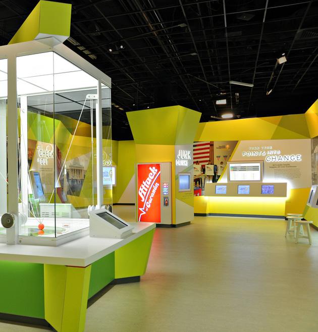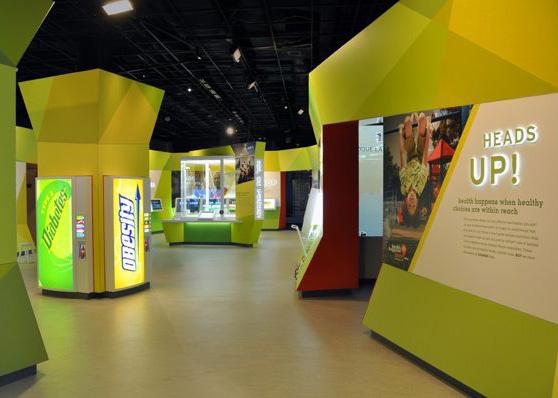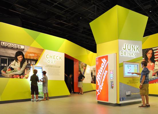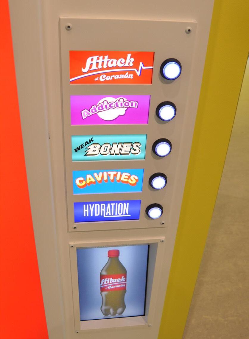 Visitors learn facts about the relationship of soda to obesity and diabetes by pressing the buttons on one of the three full size soda vending machines. There are four choices of sodas and one choice of water.