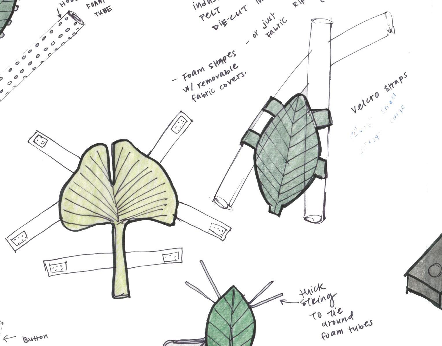 The playhouse encourages movement by giving kids physical challenges and provides interesting spaces to explore. The mushroom has a slide, nook in the lower level, and a building zone on the side of the mushroom. Children can attach foam tubes into holes on the mushroom and grass. There are foam leaves with velcrow straps that they can strap to the foam tubes to make a fort.