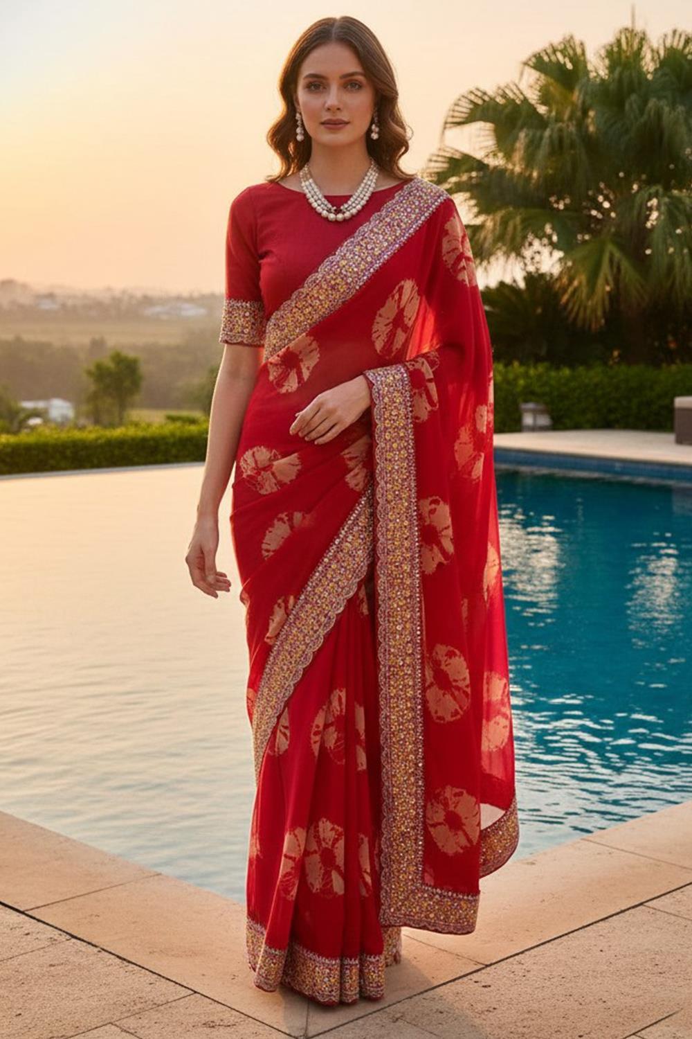Georgette sarees offer a slightly structured drape, making them an excellent choice for women who want a flattering silhouette that stays neat throughout the day. Their versatility suits both contemporary and traditional styling, and they pair effortlessly with embellished blouses for formal occasions.