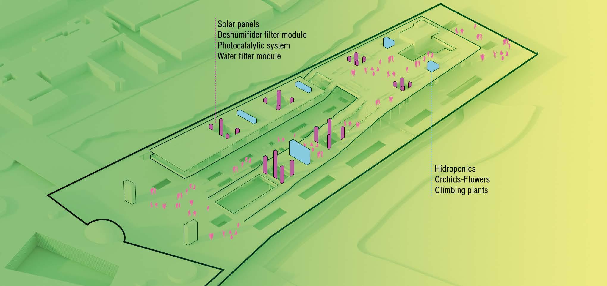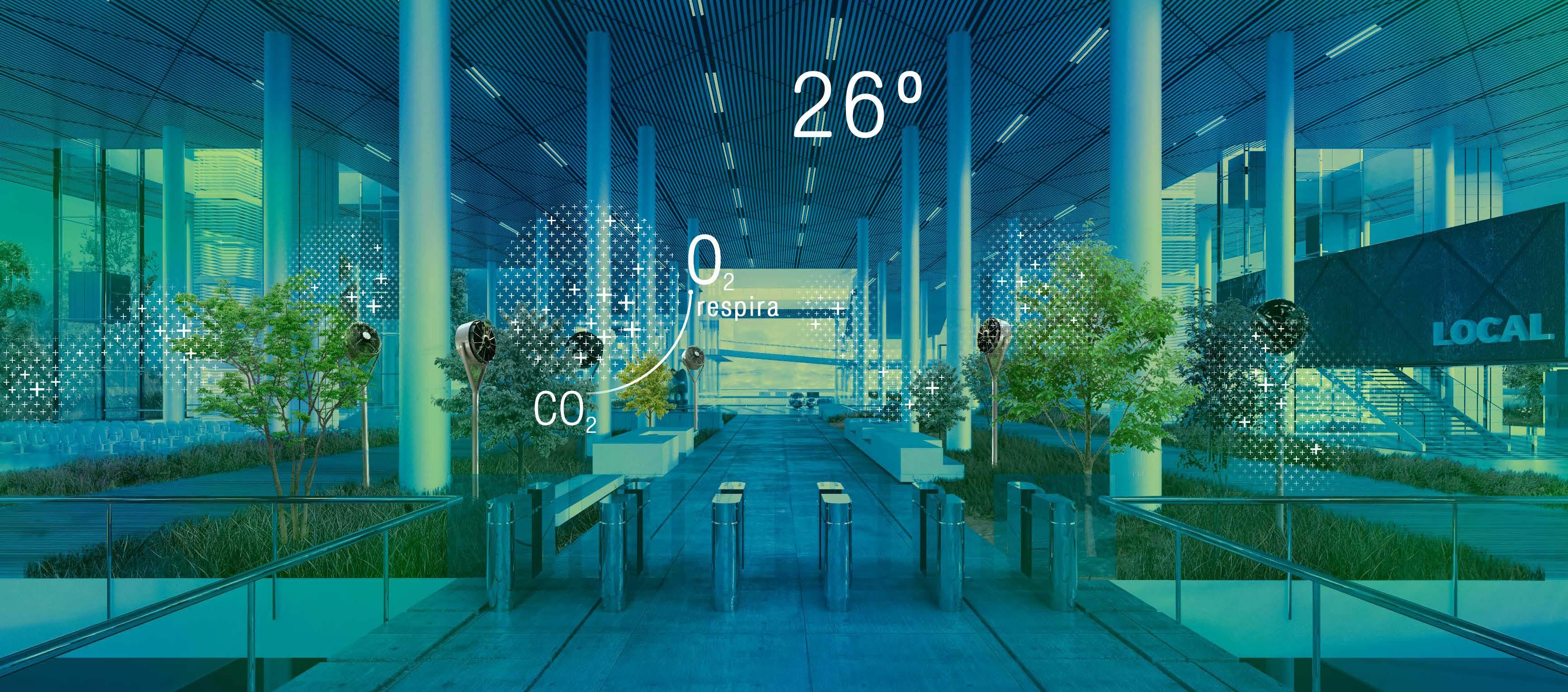 Designed to harness ecological processes and create an oasis within, featuring fan-coolers that acelerate the evapotraspiration of trees and plants. This system helps decrease the temperature by aproximately 8 °C. In one of latin America’s hottest cities, we could see temperatures drop from 34 °C to 26 °C.