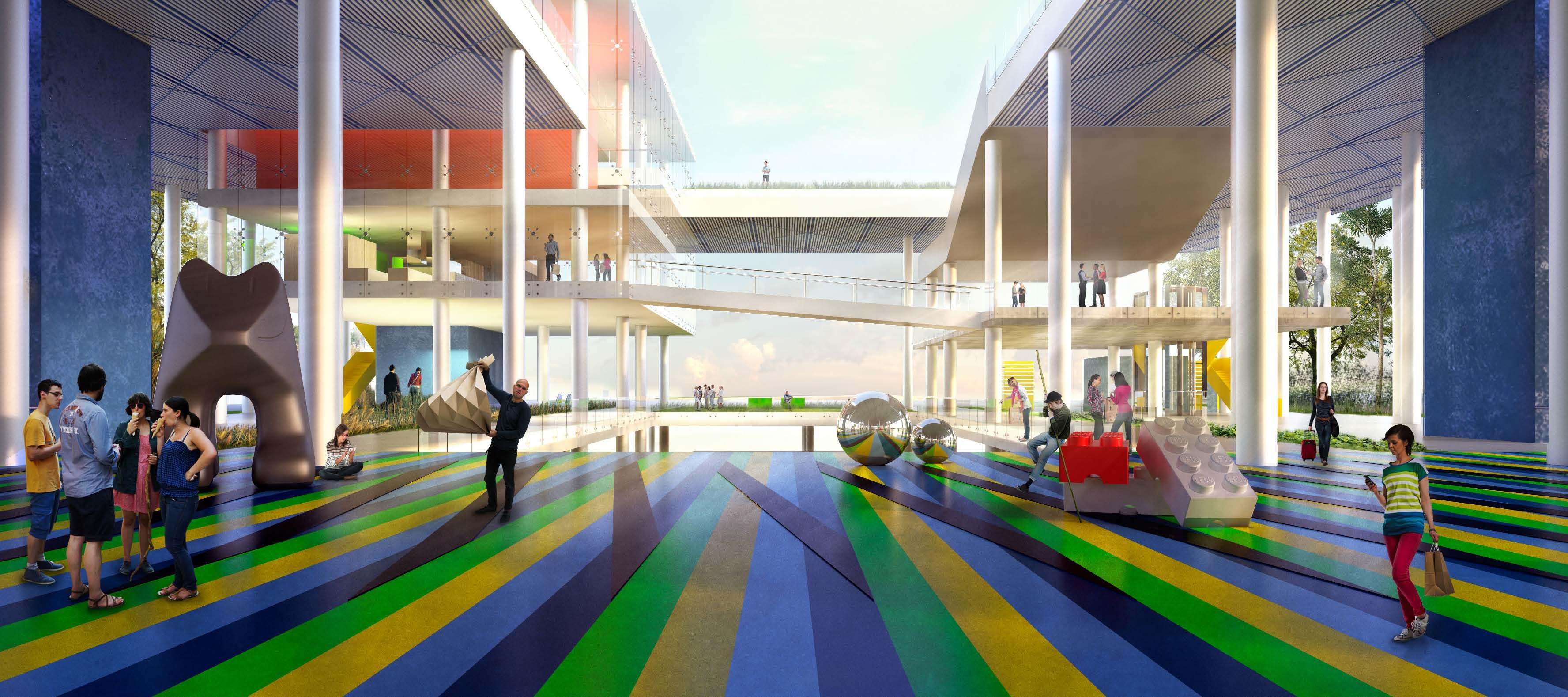 This learning system is designed as a series of liquid and dispersed programs strategically positioned across the expansive park of the university campus.