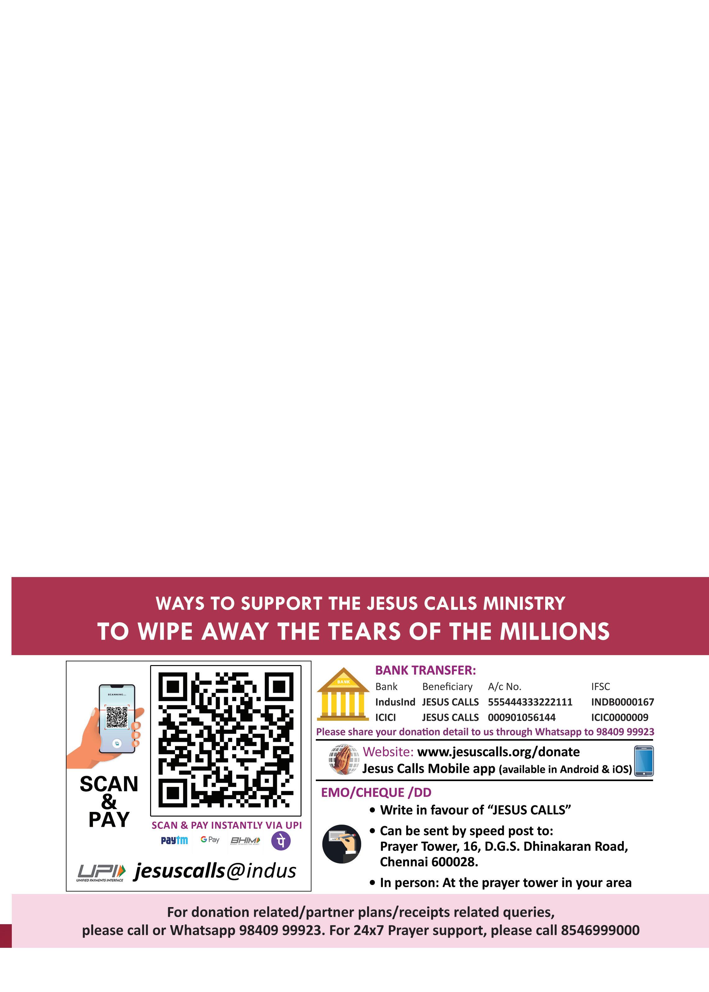 Email: ypp@jesuscalls.org (or) visit your nearest Jesus Calls Prayer Tower